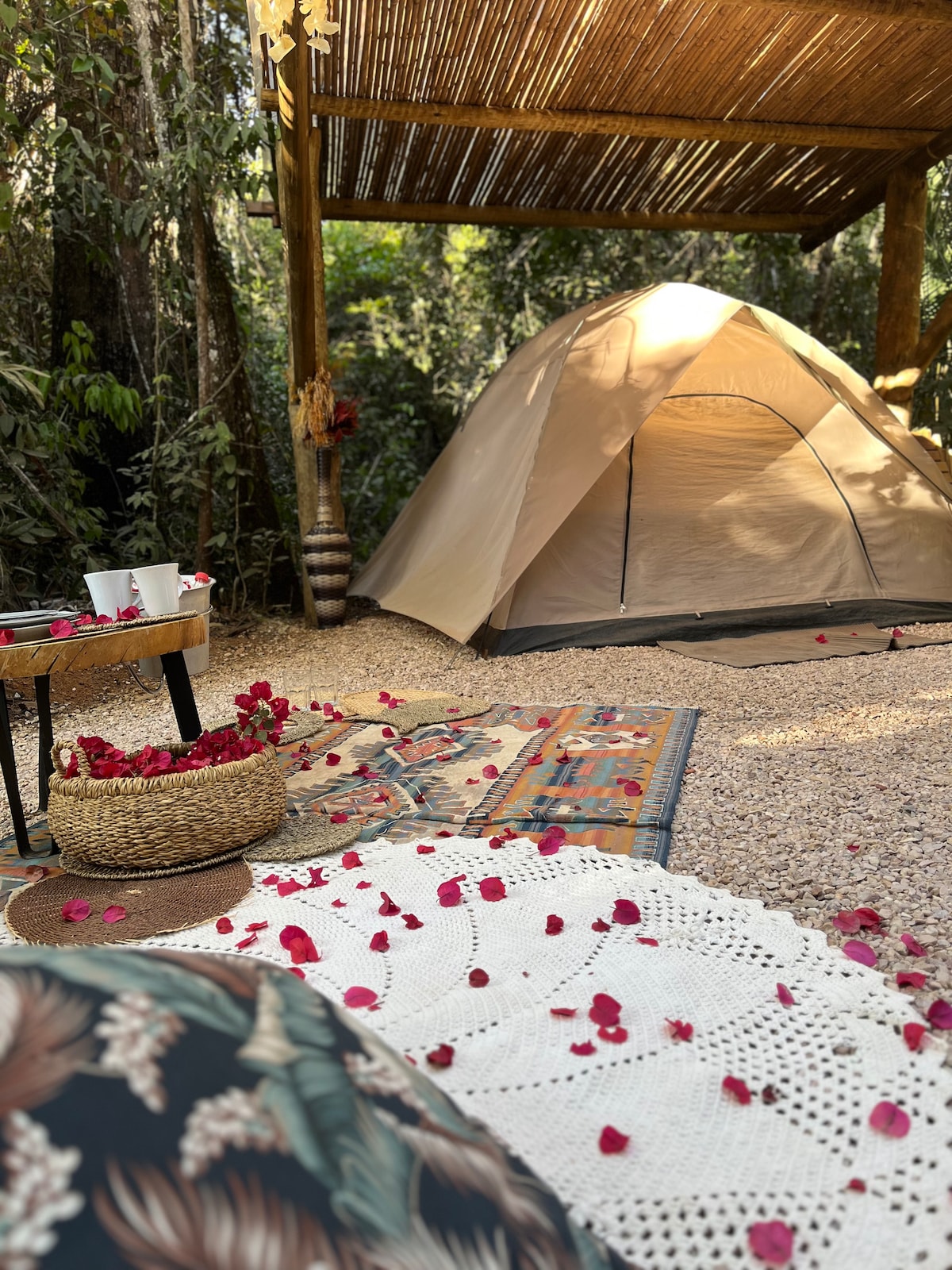 Funcionamos em época de chuva O Camping na Floresta é muito mais que uma hospedagem. Idealizado para estimular todos os sentidos e promover uma verdadeira Terapia na Floresta que vai acalmar a alma. Das barracas totalmente equipadas com muito conforto, às fogueiras, redes e espaços de lazer a natureza surpreende em cada detalhe. Tudo pensado para que a beleza e a serenidade da floresta inspire seu corpo e mente, criando momentos que vão ficar para sempre na memória. Venha viver a natureza