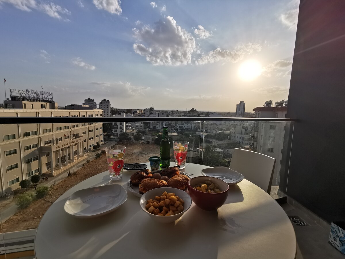 4-cü mərtəbədə heyrətamiz Beşparmak Dağı mənzərəli müasir 1+1 mənzili. Tam təchiz olunmuş mətbəx, Kondisioner, Ağıllı TV, Wi-Fi və 24/7 isti su. Ezic Premier-dan cəmi 2 km məsafədə yerləşir, küçədə bazar və düz qapının yanında idman zalı var. Rahatlıq, komfort və mənzərənin mükəmməl qarışığı.