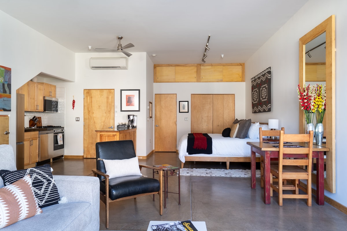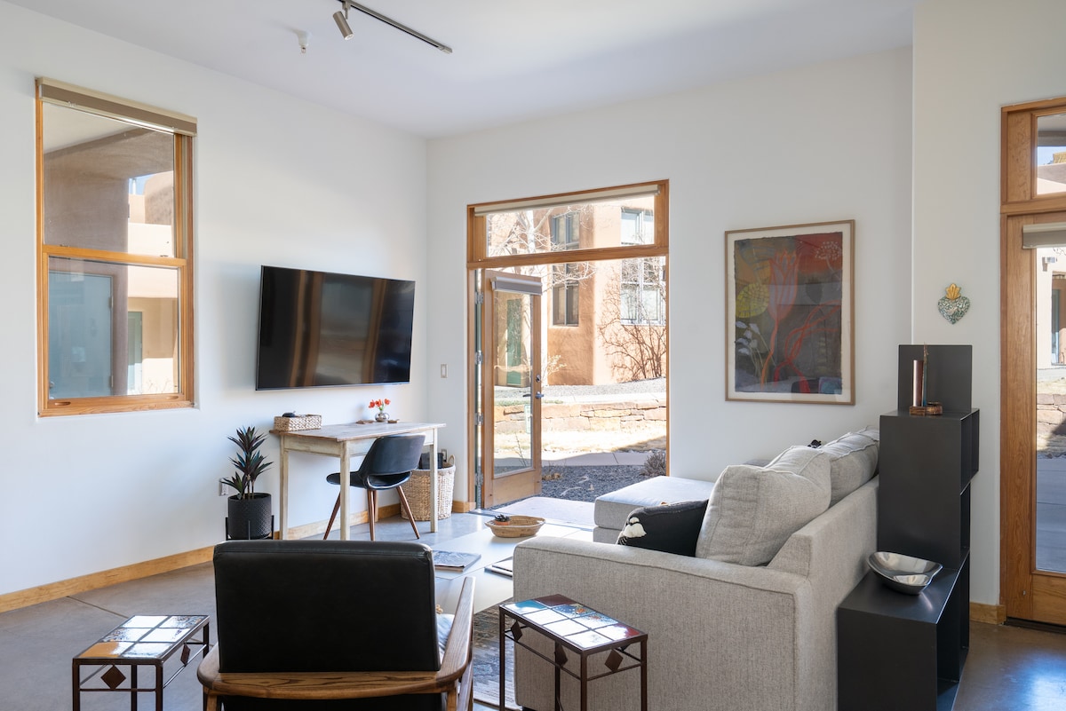 Bu açıq konsepsiyalı üç hekayə vahidi Cemez və Sanqre de Kristo dağlarının gözəl mənzərələrini təklif edir. Məkan yenidən hazırlanmış taxta döşəmə, tam yeni qübbə mətbəxi, fərdi mebel və kafel işi də daxil olmaqla incə detallarla yüklənib. Mövqe Santa-Fe mərkəzidir, lakin turistdən uzaqda yerləşir. Velosipedçilər üçün mükəmməl bir yer olan Santa-Fe "Rail Trail" velosipedi və piyada yolu pəncərənin çölündədir. Nyu-Meksiko Rail Runner qatar xətti də bir az aralıda dayanır.