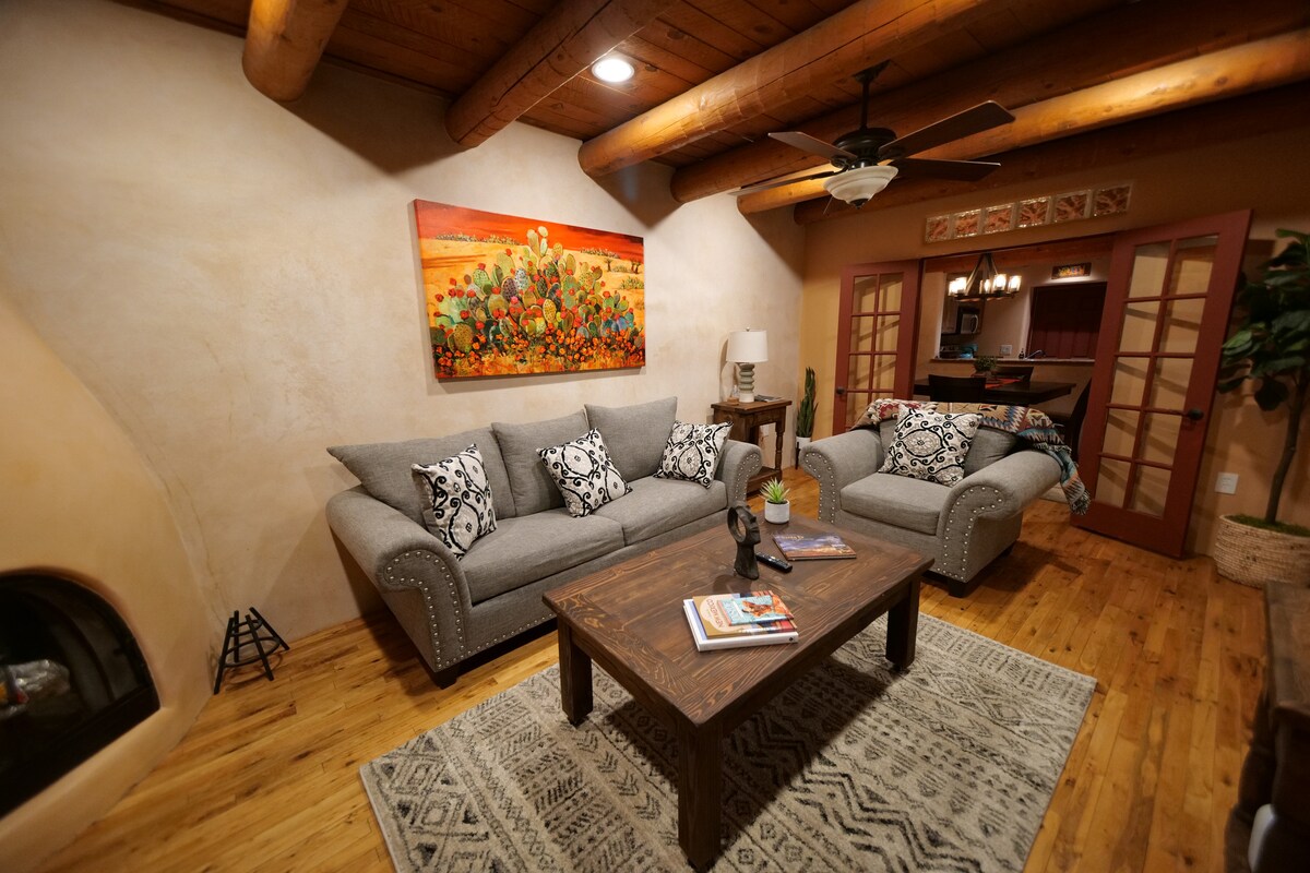 Authentic adobe casita, walk to Santa Fe Downtown Plaza (0.6 miles) and the Railyard (0.7 miles). One bedroom with kitchen, living room area with kiva fireplace, skylights throughout, and large private outdoor patio. Self check-in w/coded keypad door lock. Wall unit heat and a/c. Hot tub in shared common area. Walk 2 blocks north to Sprouts Market/DeVargas Center, 2 blocks south to Alameda River bike & walking trail. 30 minute drive up the hill to Ski Santa Fe. Dedicated off street parking
