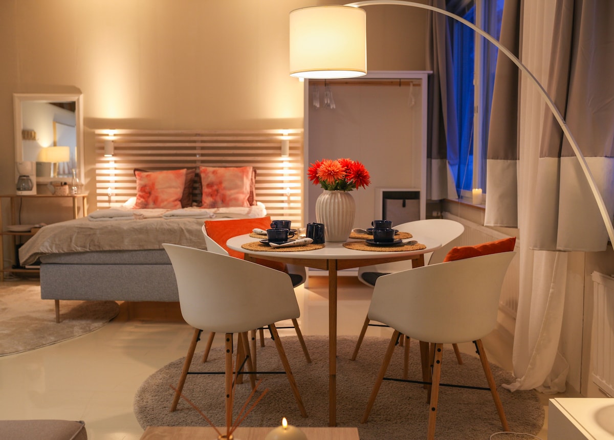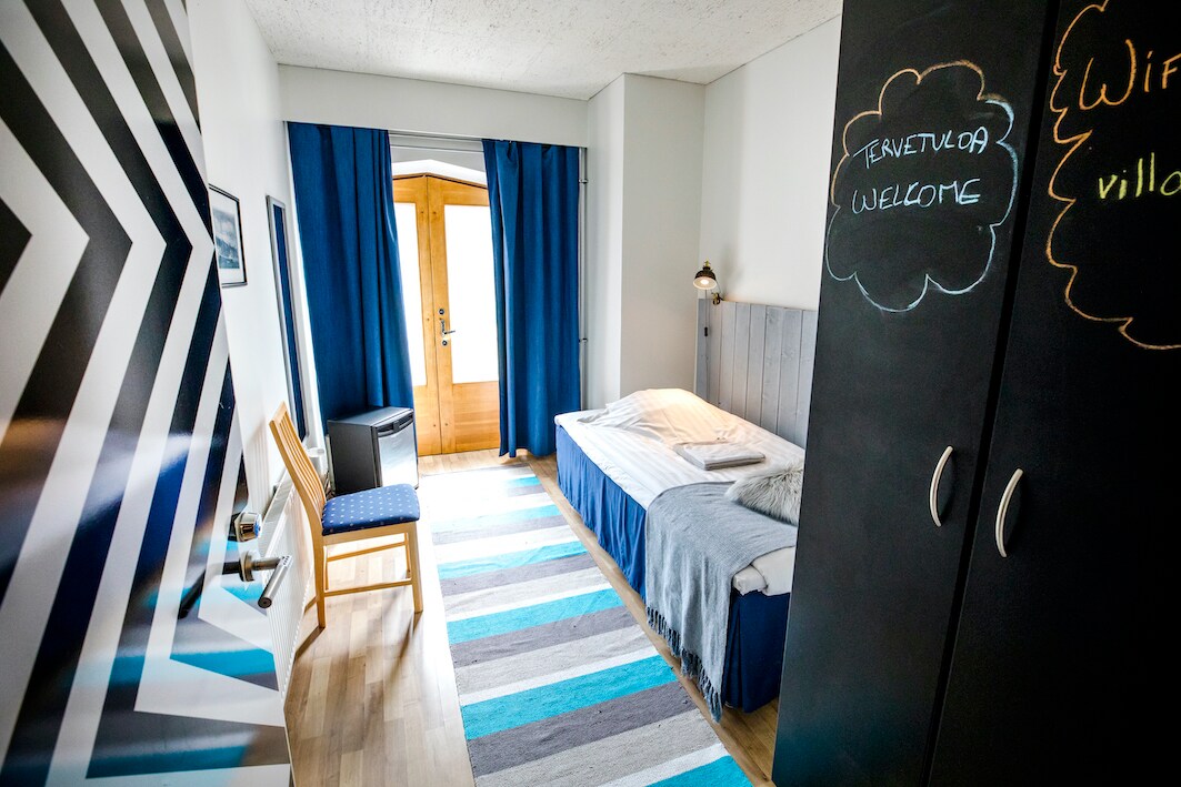 Ümumi məkanlarda yerləşən tualeti olan bir otaq. Keminin mərkəzində, çay sahilinin yaxınlığında yerləşən oteldə bir otaq. Oteldə geniş terras, pulsuz istifadə üçün saunalar, geniş mətbəx və hətta qəlyanaltı masası var. Növbəti qapıdan mağazaya getməyə vaxtınız yoxdursa, evdəki qəlyanaltı maşınından da istifadə edə bilərsiniz. Bütün otaqlarda pulsuz Wi-Fi. İstədiyiniz vaxt bizə gələ bilməyiniz üçün otelə gecə-gündüz kodlarla daxil ola bilərsiniz.