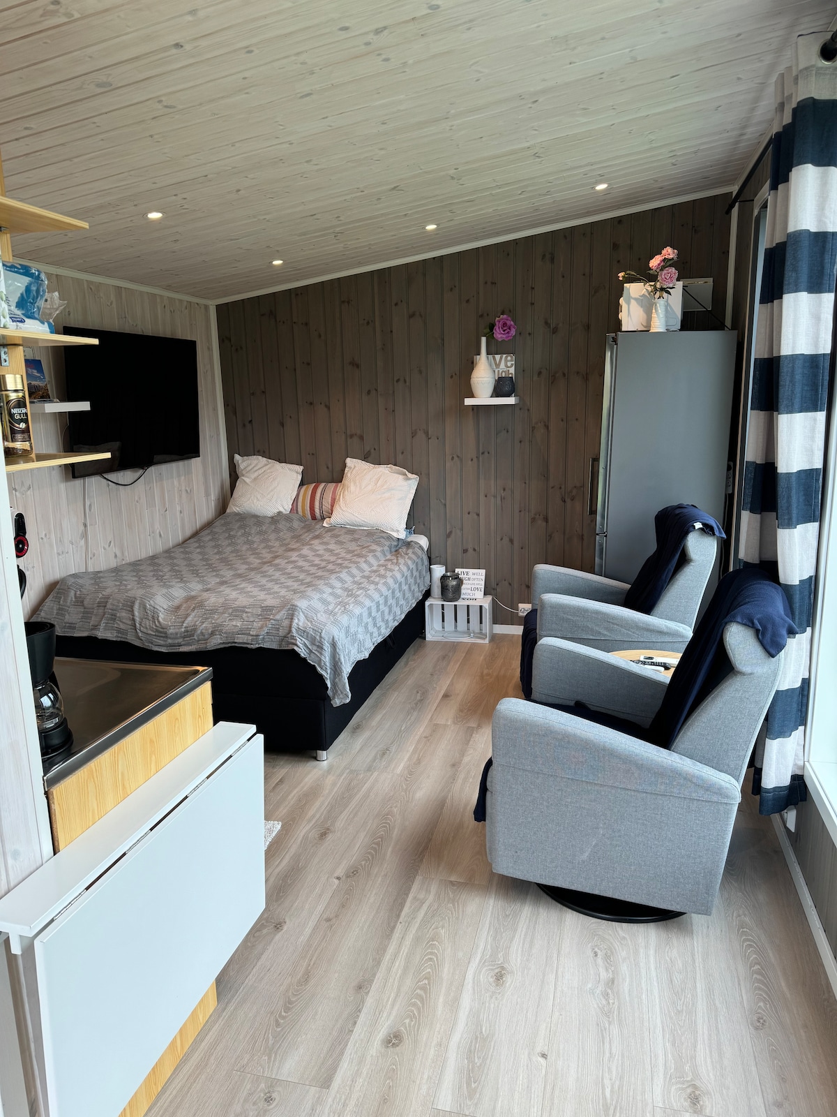 Keçmiş anbarda yeni tikilmiş üzüm üslubunda mənzil. Məkan dəniz və dağların əhatəsində yerləşir. Batut və qızıl balıq üçün məşhur balıqçılıq yeri. Gəzmək üçün bir neçə kilometr meşə yolu. Qışda Şimal işıqlarından zövq almaq üçün uyğun bir yanğın çuxuru yaratdıq ki, bu da çox vaxt səmada gözəl rəqs edir.
