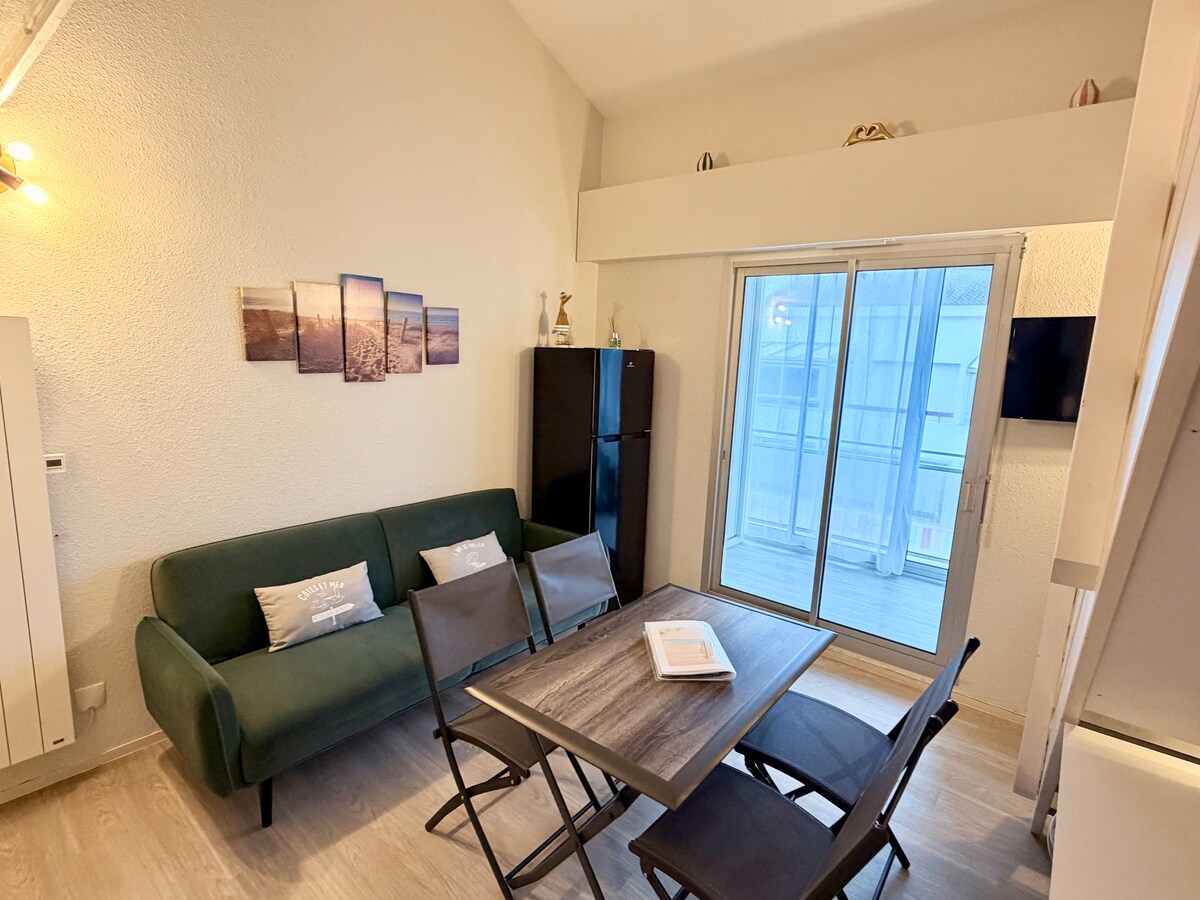 Dənizlə üzbəüz: müstəsna panoramadan zövq alın. 2024-cü ildə təmir edilmiş T2 (2/4 pers) super mənzil - ƏLA RAHATLIQ. Çimərlik və günbəz mənzilin ətəyindədir (keçmək üçün yol yoxdur). Yemək sahəsindən, loqgiyadan və hətta otağınızdakı çarpayıdan okean və Yeu adasının diqqətəlayiq mənzərələri. Sevgililər, ailələr və ya dostlarla birlikdə gün batımına heyran qalın. Öz qapalı qarajınız var; avtomobiliniz və velosiped, treyler və çimərlik oyunlarını saxlamaq üçün idealdır.