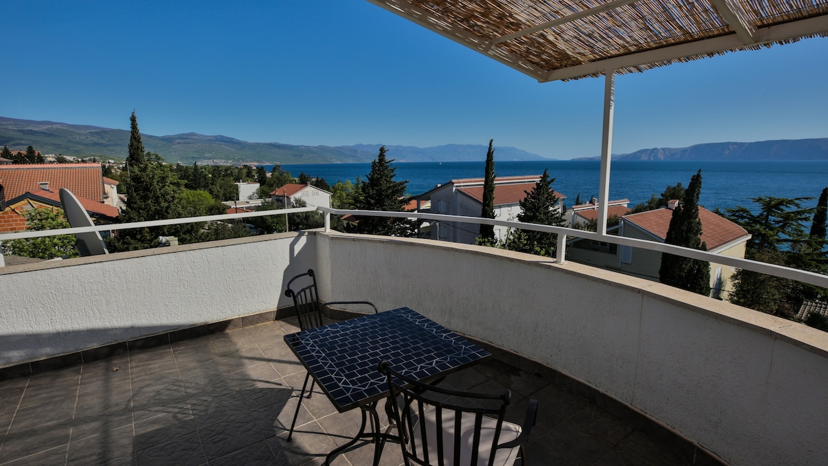 Restoran və çimərliklərdən 50 m aralıda dəniz və ada Krkda böyük terras və gözəl mənzərəsi olan 100m2 mənzil. Maksimum 9 qonaq yerləşdirmək üçün idealdır. Pulsuz yüksək sürətli internet bağlantısı (50MB/s endirmə sürəti, 9 MB/s yükləmə sürəti).