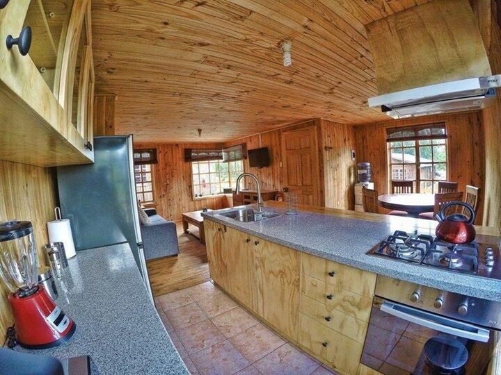 Confortable Cabaña para 7 pax, mezclamos lo rústico de la madera con materiales aislantes de ultima generación, ventanas termopanel, calefacción central, aire acondicionado, completamente equipada, living comedor, parrilla, Juegos Infantiles y más. Además tenemos para ti servicio adicional de Tina Caliente con hidromasaje. Te esperamos, reserva ya!!!