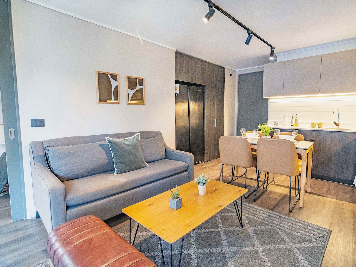 Apartamento nuevo para estrenar, perfecto para hasta 3 huéspedes. Cuenta con un dormitorio principal equipado con una cama doble y un moderno baño completo. La cocina, abierta al living, está equipada con lo necesario para preparar comidas y compartir momentos agradables. El salón incluye un cómodo sofá (ideal para el tercer huésped) y un televisor disponible para el entretenimiento. El diseño es moderno y minimalista, con detalles cálidos y terminaciones de calidad.
