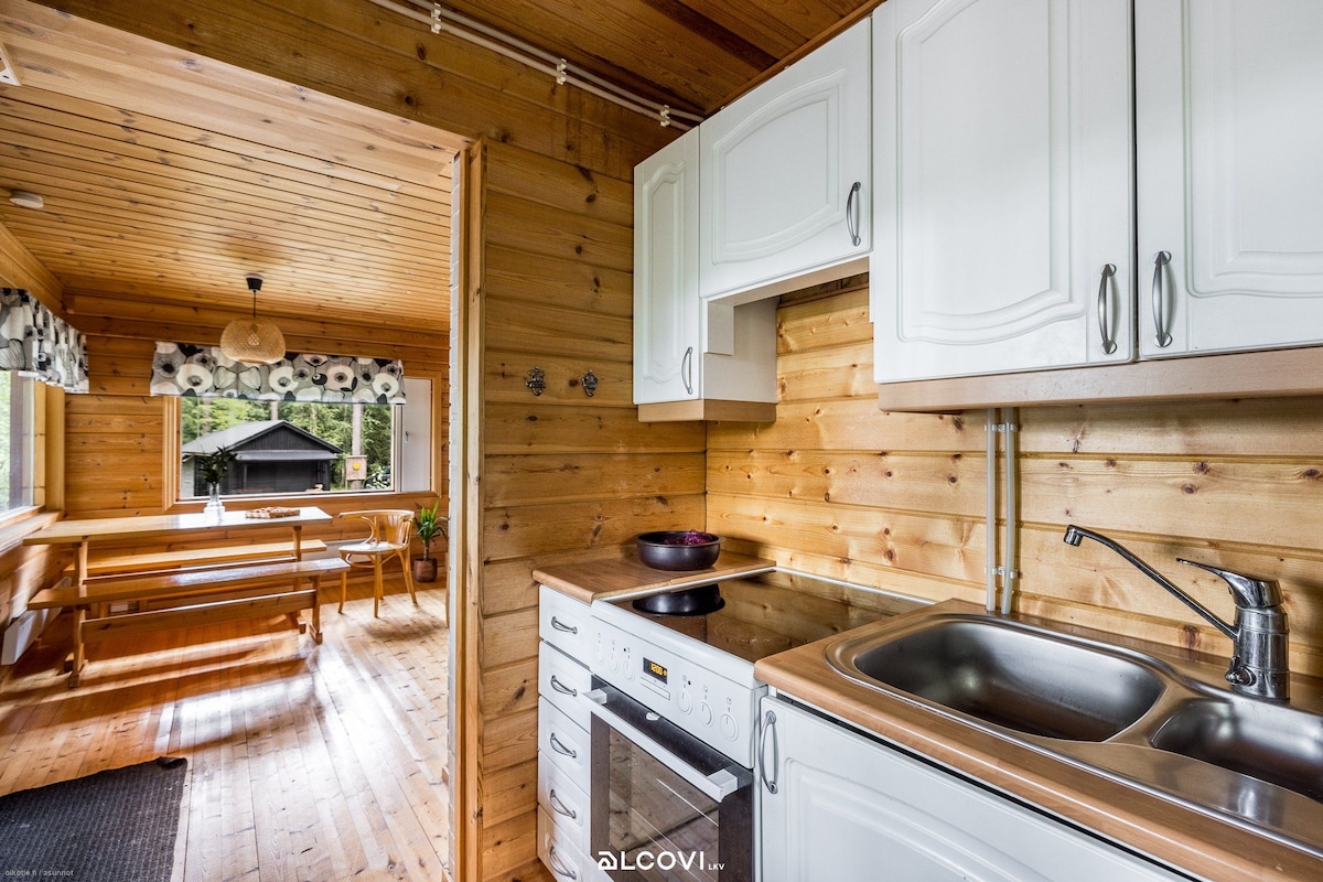 Qonaqlamanızdan zövq almaq üçün şəxsi kottecimizə xoş gəlmisiniz! Kiçik (37 m2), lakin rahat kottecimizə bütün imkanları (hava ilə qızartma cihazı, soba yoxdur) təmin edən kiçik mətbəx, böyük ənənəvi fin saunası, vanna otağı və kiçik tualet daxildir. A/C (sorğu əsasında daşınan cihaz) yayda da qonaqlamanızı xoş edir və kottec il boyu qızdırılır. Yatmaq üçün bir 150-179 sm-lik çarpayı var (160 sm). Lazım gələrsə, körpələr üçün çarpayı və 80x200 sm ölçülü bir döşək təqdim edilə bilər. Təhlükəsizlik səbəblərinə görə, saunanı sizin üçün ev sahibləri qızdıracaq.