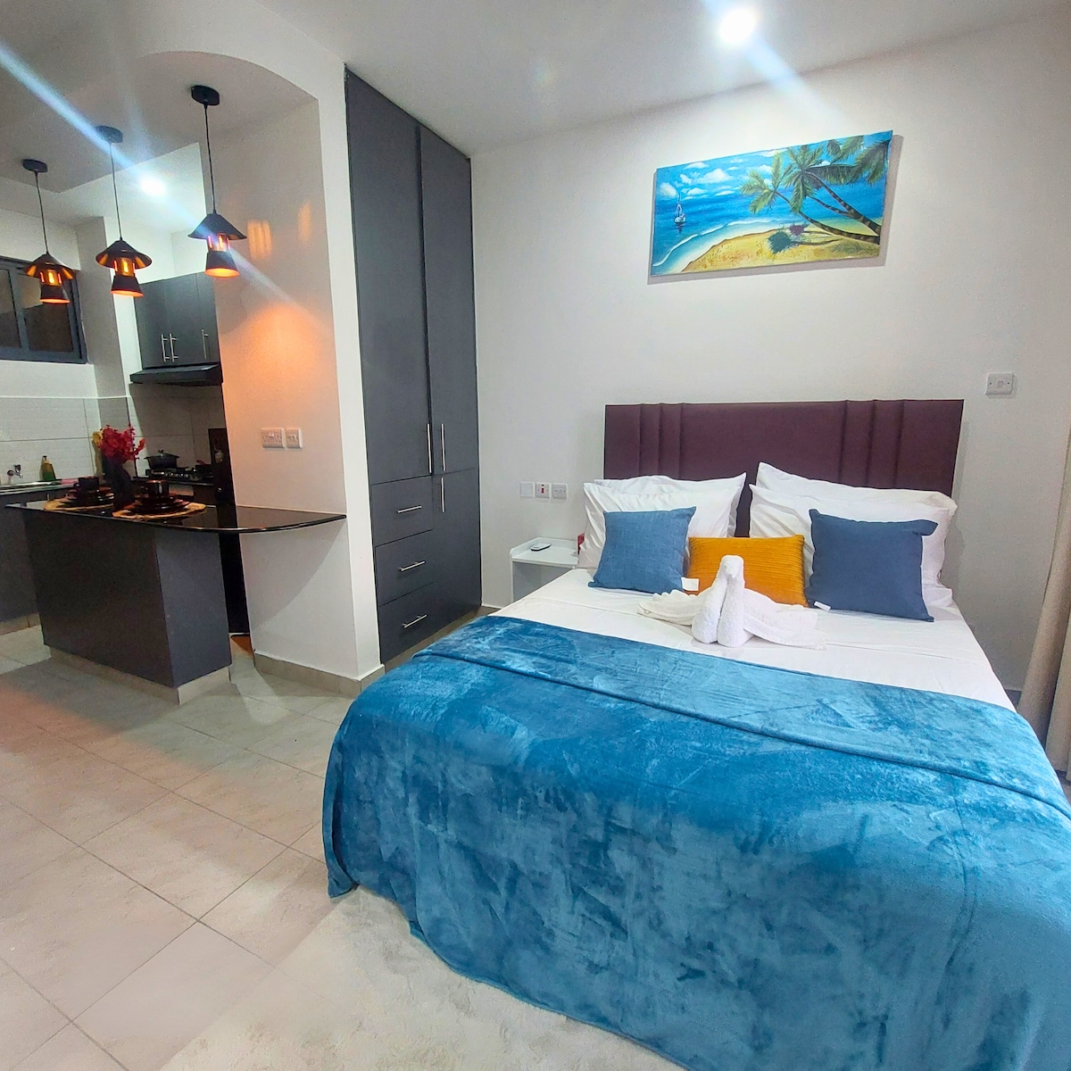 Rahat otel xidmətləri təklif edən studiya mənzili (Bamburi) mebellə təchiz olunub * Kraliça böyüklüyündə çarpayı və bir çarpayı ilə təchiz edilmiş 2 böyük və 1 uşaq və ya 3 böyük üçün uyğundur *Gündəlik təmizlik daxildir * Dörd stul, divan, qəhvə masası olan yemək masası *AC *TV * Təhlükəsiz kilidləyin * Balkon- iki stul, qəhvə masası *Mətbəx - soyuducu, mikrodalğalı soba, çaydan, qəhvə maşını, toster, çəngəl-bıçaq * İmkanlara giriş - hovuz, uşaq oyun sahəsi, çimərlik barı, restoran, idman zalı, çimərlik, camaşırxana * Moi Beynəlxalq hava limanından 21 km məsafədə *SGR Mombasa-dan 26km məsafədə