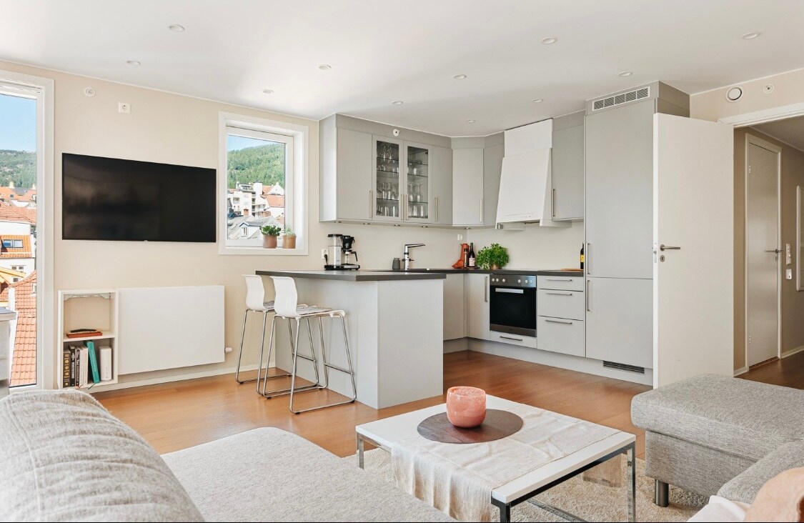 6-cı mərtəbədə yüksək standartlı məftunedici penthaus. Gözəl mənzərə, ayrıca terras və böyük 360 mənzərəli terras. Lift girişi. Bryggenə, restoranlara, pivəxanaya, parka, çimərliyə piyada məsafəsi olan çox mərkəzi yer. Qatar stansiyasına dərhal yaxınlıq. Hava limanından birbaşa girişi olan Bergen yüngül relsi. Qonşu binada ərzaq mağazası. Ən yaxın avtomobil dayanacağına 50 metr, parkinq qarajına isə 300 metr məsafədə yerləşir. 2 yataq otağı və 2 hamam otağı olan yaxşı mərtəbə planı! Pulsuz istifadə üçün paltaryuyan və qurudan maşın.