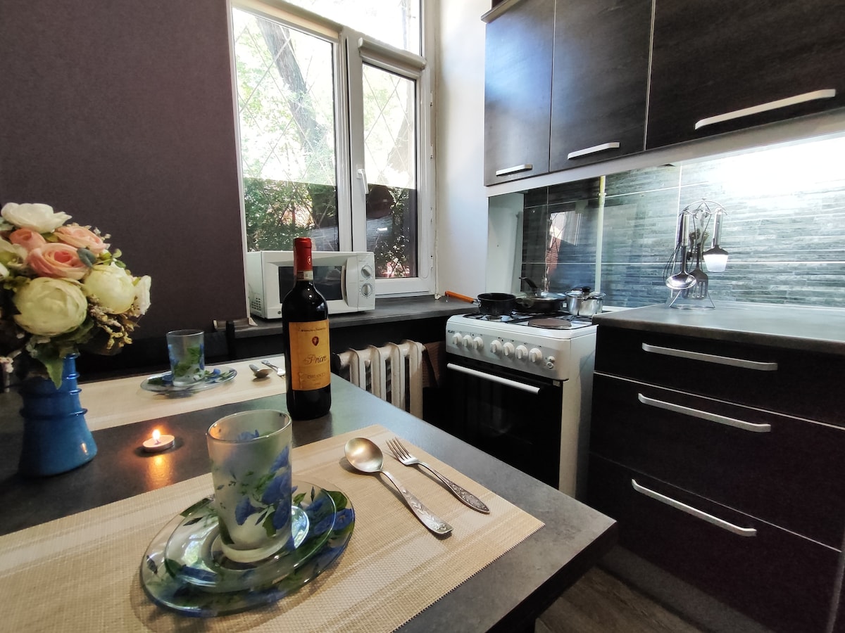 Bişkekin mərkəzində rahat mənzil* Şəhərin mərkəzində yerləşən işıqlı və dəbli mənzilə xoş gəlmisiniz! Yaxınlıqda ən yaxşı restoranlar, qəhvə mağazaları, parklar və ticarət mərkəzləri var. Hər şey gəzinti məsafəsindədir. Mənzil ehtiyacınız olan hər şeylə təchiz olunub: rahat çarpayı, kondisioner, Wi-Fi, təmiz döşəkağı-dəsmal dəsti, tam təchiz olunmuş mətbəx. Cütlüklər, işgüzar səfərlər və tək macəraçılar üçün mükəmməldir. Qonaqlamanızı mümkün qədər rahat etmək üçün hər zaman əlaqə saxlayırıq və şadıq.