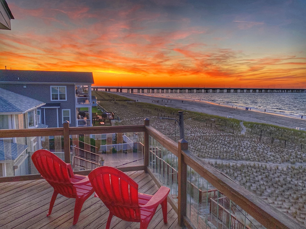 LESS THAN 1 MIN WALK TO WATERS EDGE. Fantastic beach home with 3 bdrms, 3 baths, Living room-dining rm combo with vaulted ceilings, kitchen, TV in 4 rooms, Wi-Fi, large deck with natural gas Weber grill, Washer-dryer. Great water views while you are relaxing on the deck. Many amenities! Just bring your bathing suit. Our guests have all said they love this place! Very close to many wedding venues, restaurants, state park, oceanfront boardwalk is closeby, military bases, etc.