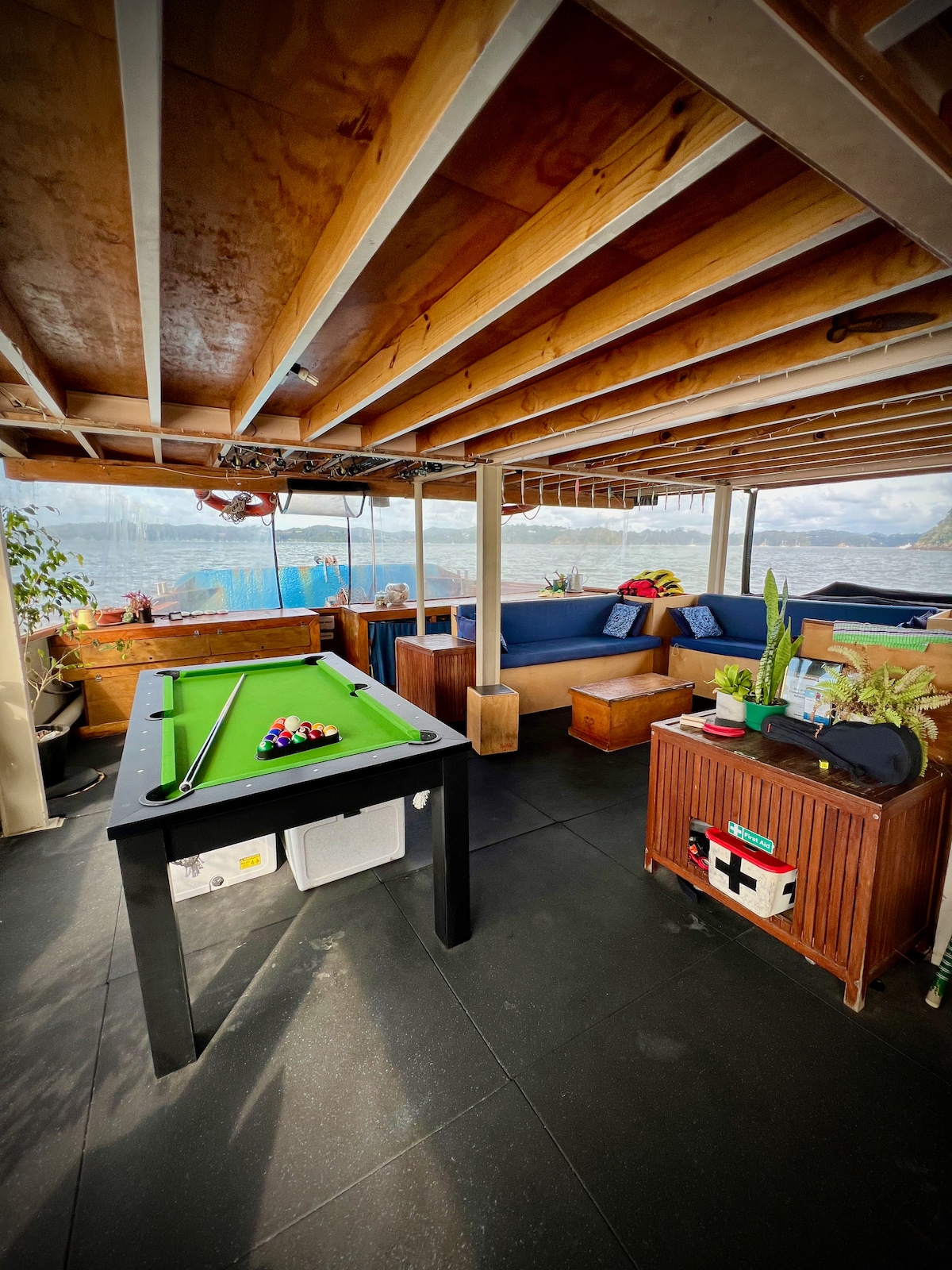 Hər iki mərtəbədən 360 dərəcə dəniz mənzərəsi, qayığın arxa göyərtəsindən asan su girişi istənilən vaxt üzməyinizə imkan verir. Unikal gəmimizin ikinci hekayəsində 8 qonaq kabinəsi, birinci mərtəbədə isə böyük açıq planlı yaşayış sahəsi var. Rahat divanlarımızda dincəlin, hovuz oyunundan zövq alın və ya qapınızın ağzında sözün əsl mənasında Adalar Körfəzi ilə pianino və gitaralarımızla musiqi yaradın. Bütün yaşlar üçün uyğundur, Yeni Zelandiyanın ən böyük qayıq evində bütün ailə üçün məkan.