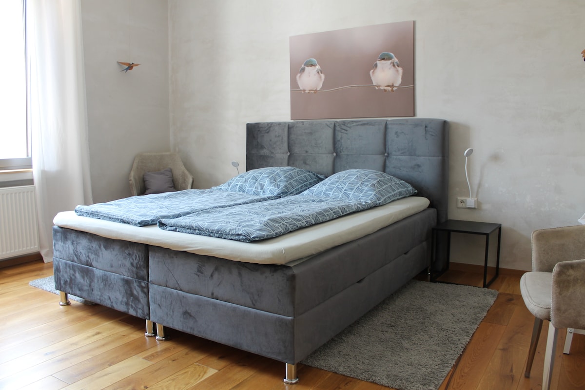 Blue Meadow bietet stilvolle Übernachtungsmöglichkeiten zum wohlfühlen, mit Balkon und Blick in den Garten ! Ländlich im OT St.Vit gelegen. 2,5km Entfernung zur schönen Altstadt von Wiedenbrück mit Restaurants und Geschäften. Kostenloser Parkplatz/Fahrradunterstellmöglichkeit direkt am Haus. 10mtr. zur Ladestation für E-Autos , Fahrstuhl, barrierearm, großes Boxspringbett, voll ausgestattete Küchenzeile, große Dusche, Waschmaschine, Pflegeprodukte, Fön, Bügeleisen. Direkte Anbindung zur A2