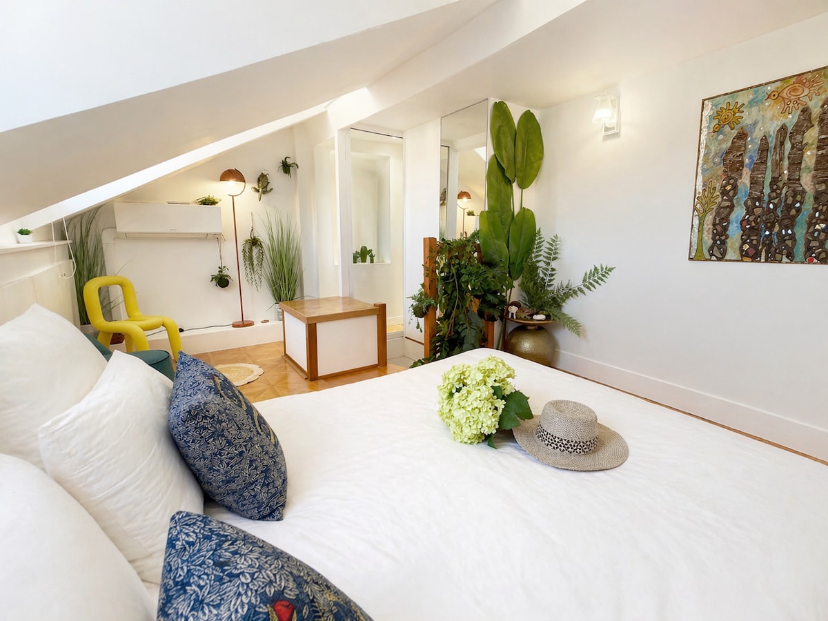 On the top floor of a Haussmann building in Nice: 3 min to the sea and the Promenade des Anglais. Every morning at 9:30, a chef breakfast (15 €): golden croissants, homemade French toast, daily pastry with rose-lavender-lemon aromas. Mini-fridge in room · workspace available on request.