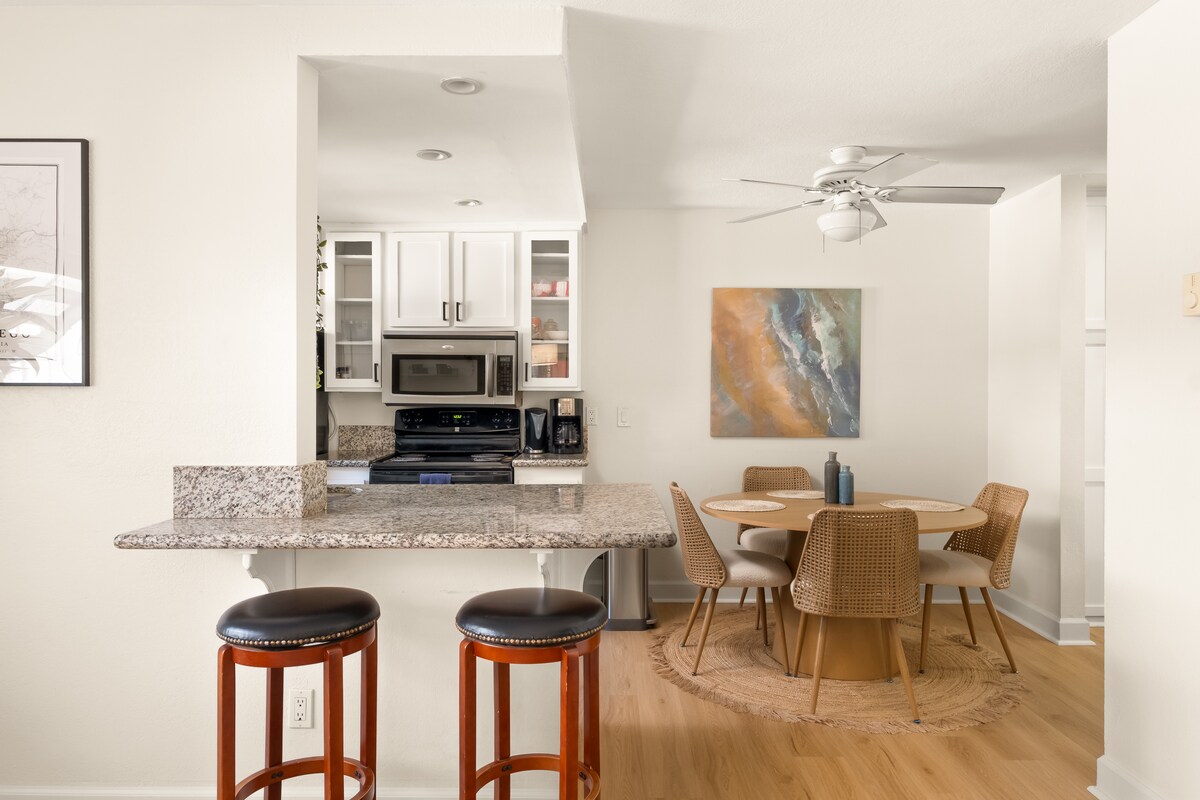 Close to the beach and even closer to the shops! Set on the top floor in a beautiful condo complex with legitimate charm. Enjoy a cup of coffee on the balcony while enjoying the gorgeous views of palm trees, mountains, & Mission Bay. All guests, young or experienced, are welcome here. Bright and airy one-bedroom with a queen-size bed and brand-new kitchen and furnishings.