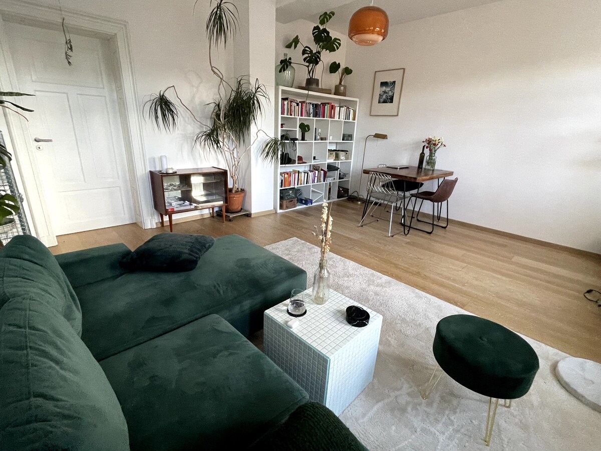 Lovely two rooms apartment with a lot of light, sun set view and greenery out the window. Neatly decorated with vibrant and colorful vintage furniture making it a cozy and a stylish place to stay. Situated in a calm street right at the corner of Karl-Heine-Straße where bars, restaurants and cafes are plenty to choose from. Walking distance from art galleries, cinemas and theatres (see my guid book). Near to everything, public transport are available at a 3 minutes walk.