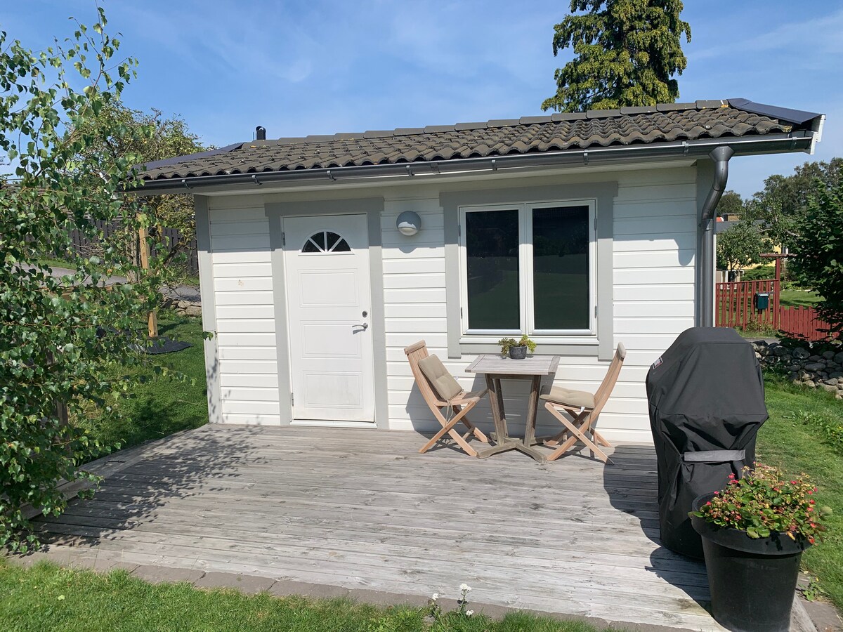 Vårt lilla gästhus, ljust och luftigt, i en egen del av trädgården, i ett lugnt område. Det har två sköna sängar nere och två madrasser på sovloftet. Toalett, microugn, liten kyl, litet utekök, grill, lakan, handdukar och utemöbler på den lilla terassen och i porten. Egen dusch via egen ingång i det stora huset nära. Hängmatta och oftast två cyklar. Teresa, bildkonstnär, jobbar i ateljén, trädgården eller tar en paus på stranden. Vi trivs med gäster och gör vårt bästa för att alla ska trivas.