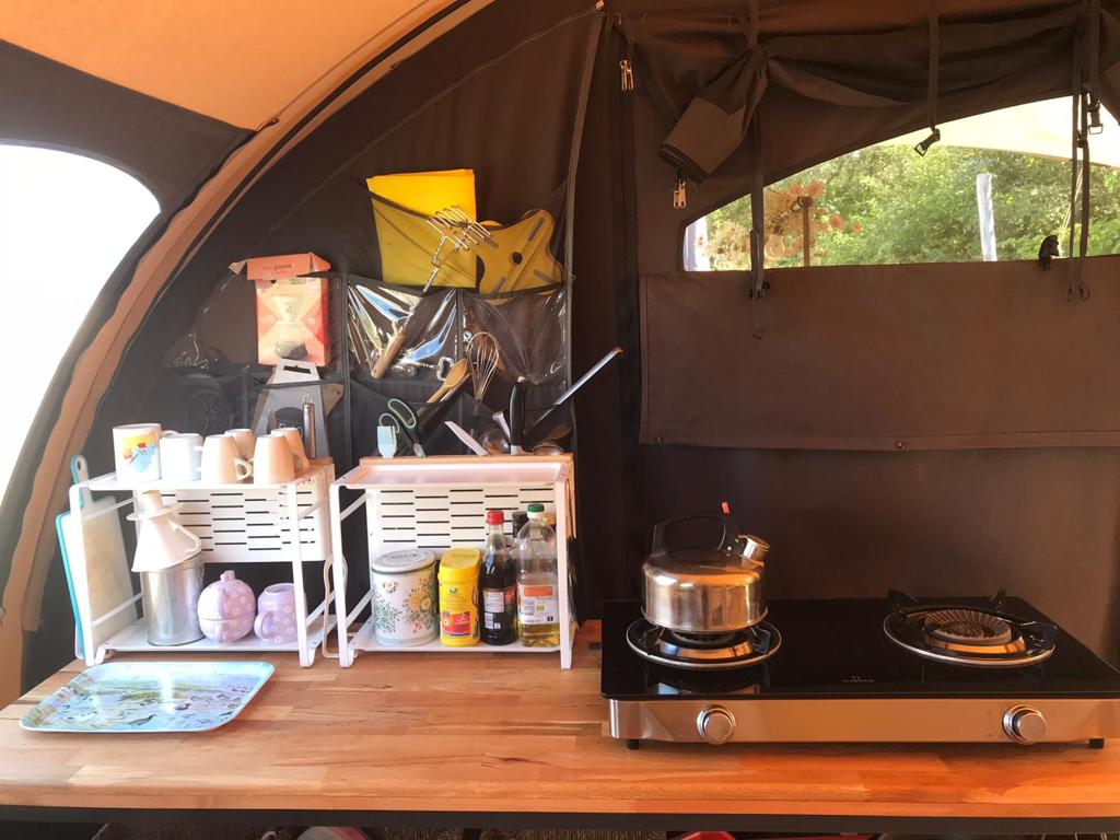 Fantastik De Waard Steenuil tağlı çadırımızda üç yataq kabinəsi (hər biri 160x260), qonaq otağı (480x300) və qapalı tent (480x200) var. Maksimum hündürlüyü 2.40 metrdir. Çadır tamamilə döşənilib: taxta çarpayılar, döşəklər (2 ədəd 130x210 və 1 ədəd 90x210), böyük soyuducu (qaz), 3 tam qaz sobası, boşqab və çəngəl-bıçaq, iki Lundia saxlama şkafı, tent altında döşəmələr, pivə masası və oturacaqlar, günəşlik, qamak və dəbdəbəli şezlonglar. Öz yataq dəstlərinizi gətirin!