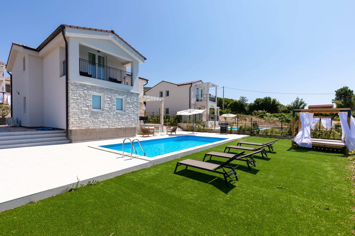 Dənizdən cəmi bir neçə kilometr aralıda, dinc ətrafda və geniş ərazidə yerləşən bu yaxşı təchiz olunmuş və konseptual dizaynlı villa həqiqətən rahat tətil üçün ən yaxşı inqrediyentləri təklif edir. Villaların qonaqları ən yaxşı əyləncə və istirahətiniz üçün yerində çoxlu fəaliyyətlərlə birlikdə hər iki yüksək qonaqlama standartından zövq alacaqlar. Qeyri-adi 75 m² sonsuzluq hovuzu, eləcə də möhtəşəm dəniz mənzərələri təklif edən Spa hamamı ilə birlikdə villadan çıxmamağı seçə bilərsiniz. Ən yaxşı əyləncə və istirahətiniz üçün villa yeniyetmə və böyüklər üçün bilyardlı oyun otağı, uşaqlar üçün oyun meydançası və bütün qrup üçün istirahət zonası ilə təchiz olunub. Ən yaxın ərazidə gözəl çınqıl və qayalı çimərliklər tapa bilərsiniz və cəmi 1 km-lik qısa məsafə sizi qayıq səfərləri və gözəl dəniz məhsulları restoranları təklif edən kiçik füsunkar liman Trgetə aparacaq.