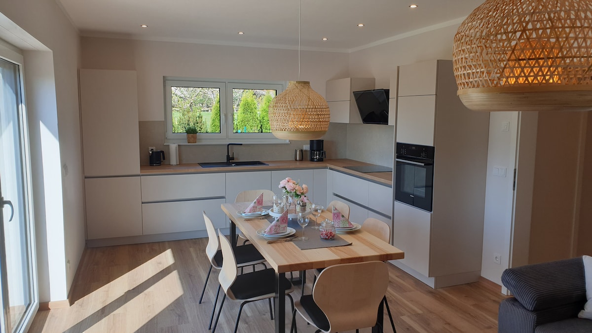 Helle, freundliche Dachgeschosswohnung. Es gibt ein Doppelbett und ein Reisebett für Kleinkinder im Schlafzimmer und eine Couch im Wohnzimmer. In der geräumigen Küche kann in gemütlicher Runde gegessen werden. Im Bad gibt es eine Badewanne mit Duschabtrennung. Die Wohnung befindet sich im Haus meiner Mama. Sie kümmert sich um die Schlüsselübergabe. Bei Buchung mit Hund fallen 5 € zusätzlich pro Tier und Nacht an. Bitte die Kurtaxe in Höhe von 2,50 € pro Person bar vor Ort bezahlen.