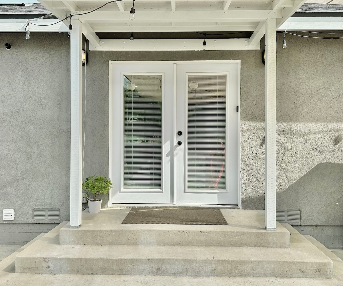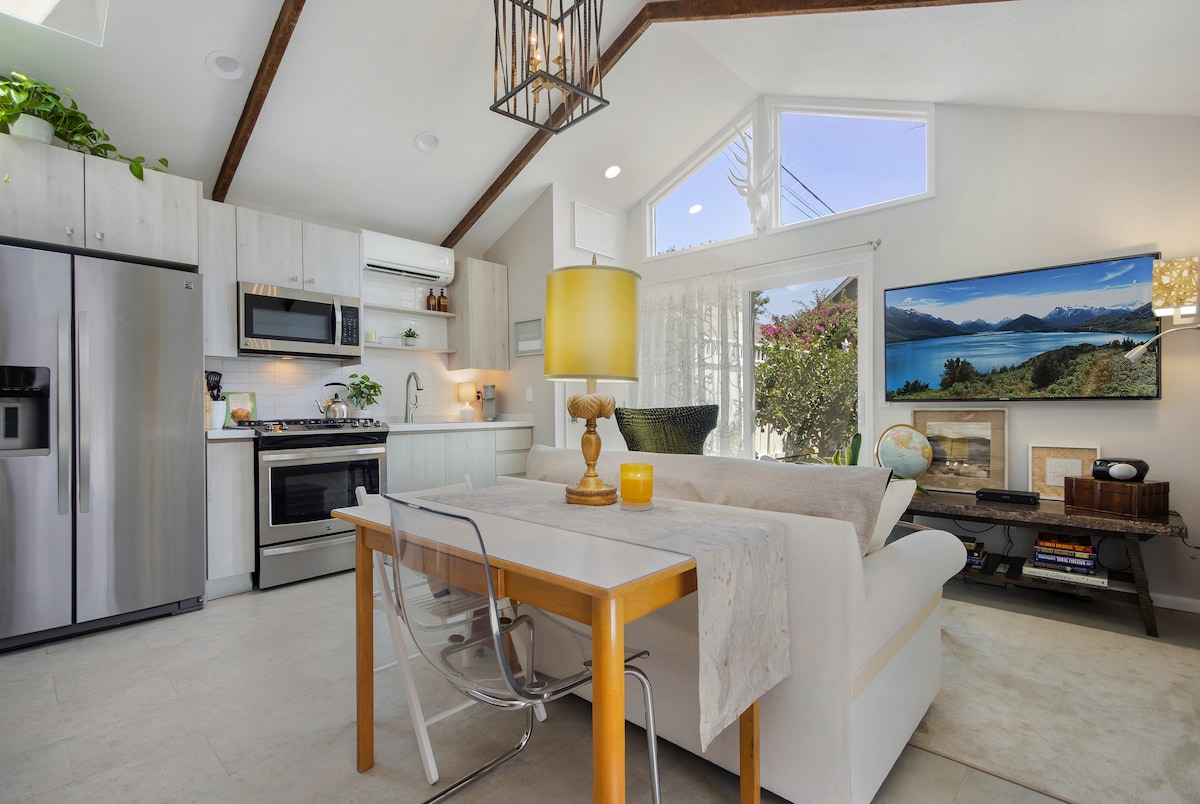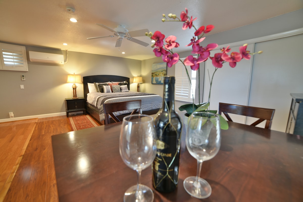 Sunny Days is a beautiful and spacious 600 sq. ft. studio apartment with a private entrance and patio. You'll love the bright and airy space, complete with 10-foot ceilings! In the evenings, relax with a glass of wine in the cozy private patio, grilling dinner on the BBQ, and hanging around the gas fire pit. We are centrally located to Newport Beach, John Wayne Airport, and Disneyland. Only a short walk to TeWinkle Park and the OC Fairgrounds. Easy free street parking in a lovely neighborhood.