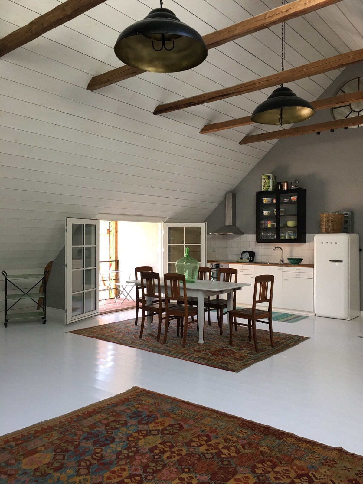 Newly refurbished 100 sq. meter atelje/apartment with a cozy loft,and balcony in a charming old barn surrounded by a large beautiful garden. Located in the quaint village of Ingelstorp. Fantastic beaches only minutes away. Beautiful countryside, rose gardens, nature reserves, art galleries, antique & interior design, fleamarkets and critically acclaimed bakeries and restaurants. The apt is available only on a weekly basis Sun-Sun in July & the first 2 weeks in August.
