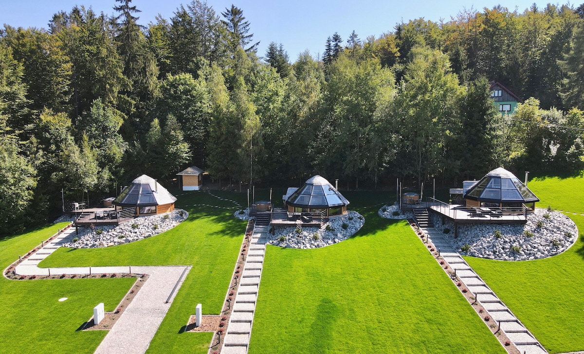 Kotteclər əsas yoldan cəmi 50 m məsafədə və Snowparadise Oščadnica Veõká Rača part Lily dağ-xizək kurortundan 3 km məsafədə təbiətlə əhatə olunmuş tənha ərazidə yerləşir. Hər bir kottecdə açılan çarpayı şəklində əlavə çarpayısı olan 3 ikinəfərlik otaq, duş kabinəsi olan hamam otağı, buxarısı olan ümumi otaq və tam təchiz olunmuş balaca mətbəx var. Hər bir taxta evin Wi-Fi internet bağlantısı var. Hər bir kottecə açıq havada oturma sahəsi, buxarı, kuldron, barbekü qril və buxarı alətləri daxildir.