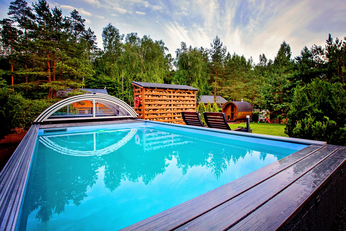 A two-story house with a terrace, garden, and stunning views of nature. 4 bedrooms, 3 bathrooms, 2 kitchens, and a spacious living room with a fireplace. All fresh and functionally furnished. The garden features a lawn, forest, a fireplace, a grill, loungers, hammocks, and a swing. The perfect place for a family or friends to escape the hustle and bustle of the city. No neighbors on the immediate border. Forests, lakes, bike trails, and kayaking trails are nearby. No large parties allowed.