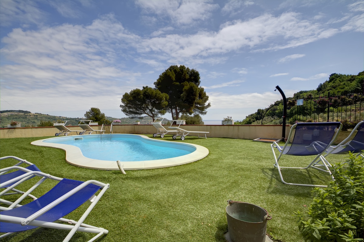 Elegante villa immersa nel verde appena ristrutturata con vista sull'Isola di Bergeggi. Ampia terrazza con copertura a vele dotata di vasca idromassaggio a filo, BBQ e cucina, lavello, ice maker, doccia esterna con acqua calda, salottino per aperitivi, Chaise-Longue e grande tavolo da pranzo. Nel soggiorno troverete la TV (Netflix), salotto e tavolo da pranzo la casa si completa con ampia cucina 2 camere da letto e 2 bagni. Sono a disposizione 2 posti auto privati, WI-FI e climatizzazione.
