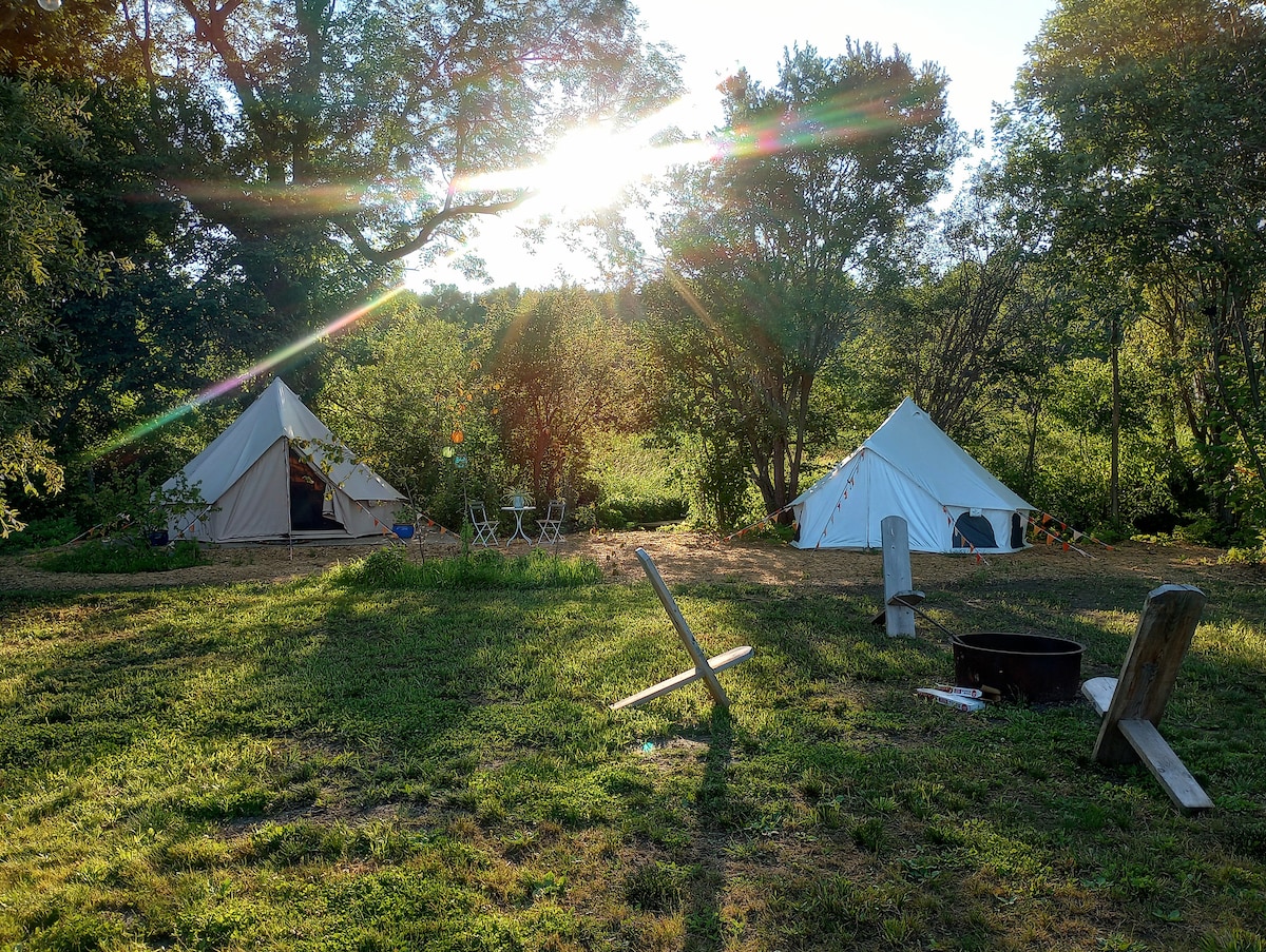 PROSPECTOR TENT CAMPSITE The creek is your companion at our farm-forest getaway. There is no electricity or water. Your outhouse is around the corner for your convenience. A propane bbq and a grill over the fire pit is provided.