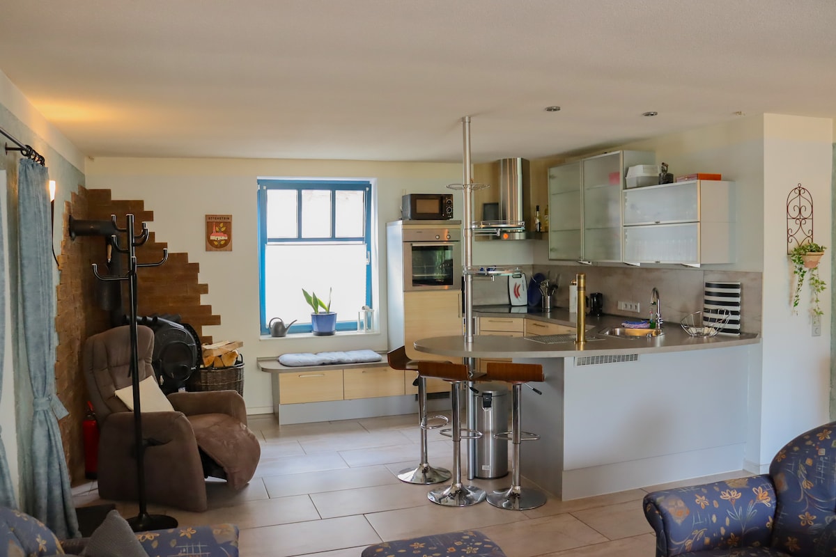 Schöne, moderne Ferienwohnung in ruhiger Lage am Königsberg bietet Platz für 2 Gäste. Küche mit Essplatz, Backofen, Toaster, Kaffeemaschine, Tageslichtbad mit Dusche, Separater Schlafraum, Wohnbereich mit Arbeitsplatz/ Essbereich. Überdachter Balkon nach Südosten mit Strandkorb und schöner Aussicht. Waschmaschine, Trockner können genutzt Bettwäsche, Handtücher werden gestellt. Ein Reisebett /Hochstuhl für Kinder stehen zur Verfügung. Rauchen ist auf dem Balkon gestattet, keine Haustiere.