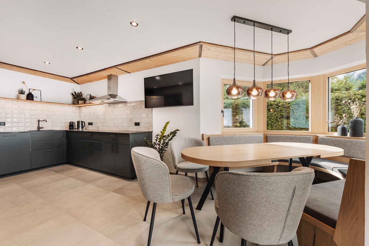 Apartment Schönblick is a newly renovated Tyrolean retreat with floor-to-ceiling windows offering breathtaking views of the Gleirsch Valley and surrounding mountains. Enjoy traditional and authentic furnishings blended with modern comfort, two bedrooms (2 king beds + 1 single bed), a bright living/dining area, fully equipped kitchen, new bathroom, heated floors, and the mountain panorama—your perfect alpine escape for winter skiing or summer hiking.