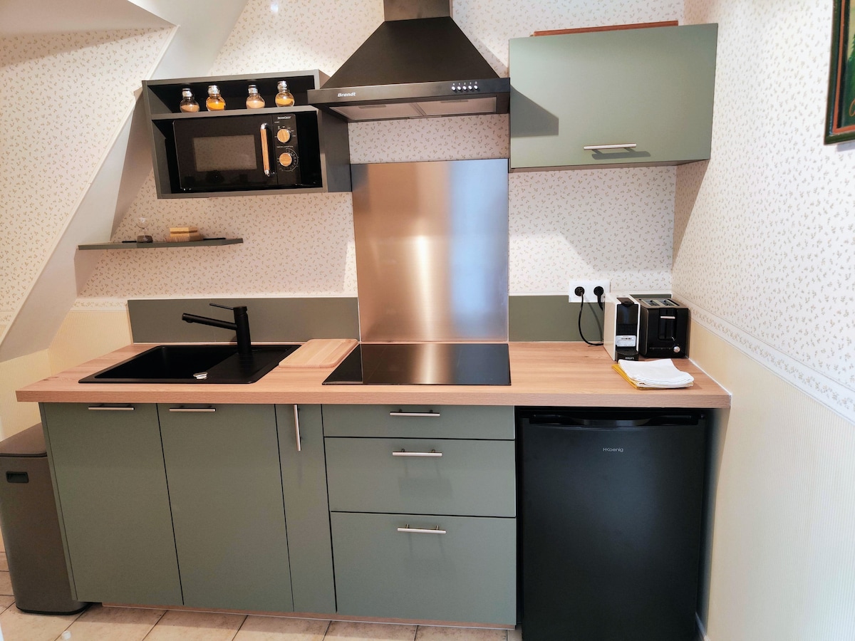 Studiya kənddə xüsusi spa (paylaşılan deyil) ilə sakitdir. Pont l eveque-dən 4 km, Parisdən 2 saat, çimərliklərdən 15 dəqiqəlik məsafədə yerləşir. Mağazalar, qatar stansiyası, su fəaliyyətləri olan Eveque Bridge gölü və avtomobil dövrəsi 4 km uzaqlıqdadır. Bütün il boyu oturmuş və uzanan mövqeləri olan 6 nəfərlik Spa (bir çox masaj təyyarəsi) Nespresso qəhvə maşını və kapsulları çaydan və çaydan, mikrodalğalı soba mövcuddur. Ürəkaçan səhər yeməyi, yataq dəsti, tualet daxildir