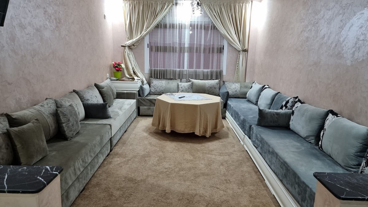 Oujda fakültədən və Çudan bir neçə dəqiqəlik məsafədə yerləşən parlaq, kondisionerli və tam təchiz olunmuş mənzil. Çox sakit, müasir, təmiz, rahat və təhlükəsiz şərait təklif edən ailəvi qonaqlamalar üçün idealdır Qonaqlama yerində şəxsi parkinqi olan xoş balkon, paltaryuyan maşın, televizor və rahat qonaqlama üçün lazım olan hər şey var. Döşəkağılar və dəsmallar təmin edilir. Məhəlləyə hörmət etmək üçün şənlik və şənliklər qəti qadağandır