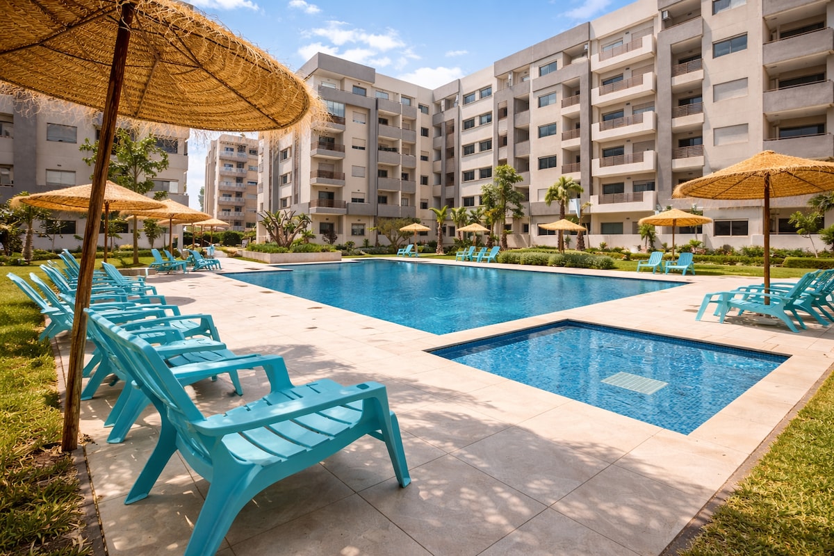 Modern apartment 5 min from CMN Airport, with pool access, private pool-view balcony, fiber WiFi & 24/7 self check-in. Queen size bed bedroom, bright living room, fully equipped kitchen. Perfect for transit travelers, business guests & families. 30 min to Casablanca, under 1h to Rabat. Flexible arrival, no waiting, your comfort is our priority.