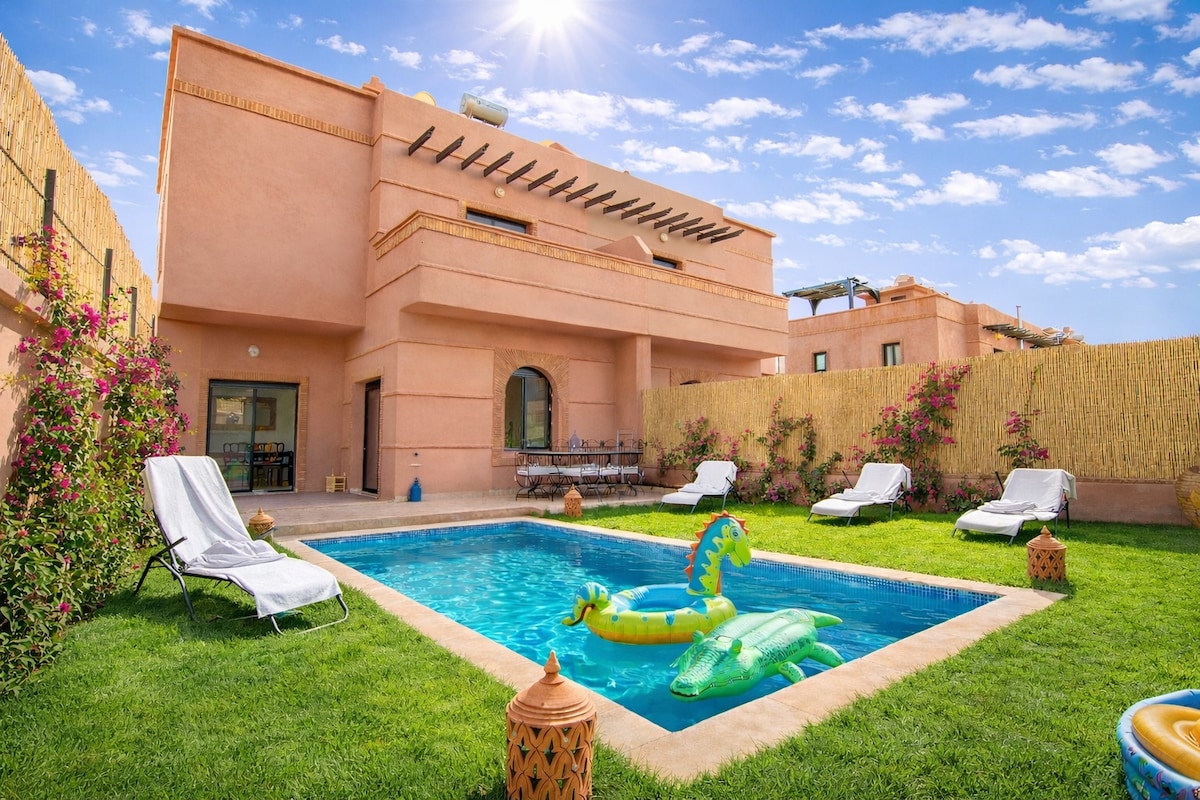 Villa située à +/- 30 minutes de Gueliz et de la médina dans un charmant domaine sécurisé 24/7 avec un terrain de tennis commun et de piscine privées. La villa se compose de 3 tres grandes suites avec chacune leur cheminée, leur télé (Netflix gratuit), 3 salles de bain, d'une petite piscine intérieure chauffée, d'une piscine extérieure privative et d'un jardin privatif sans vis à vis, d'un salon avec cheminée. Table à manger convertible en billard ou en table de ping-pong. Villa au calme.