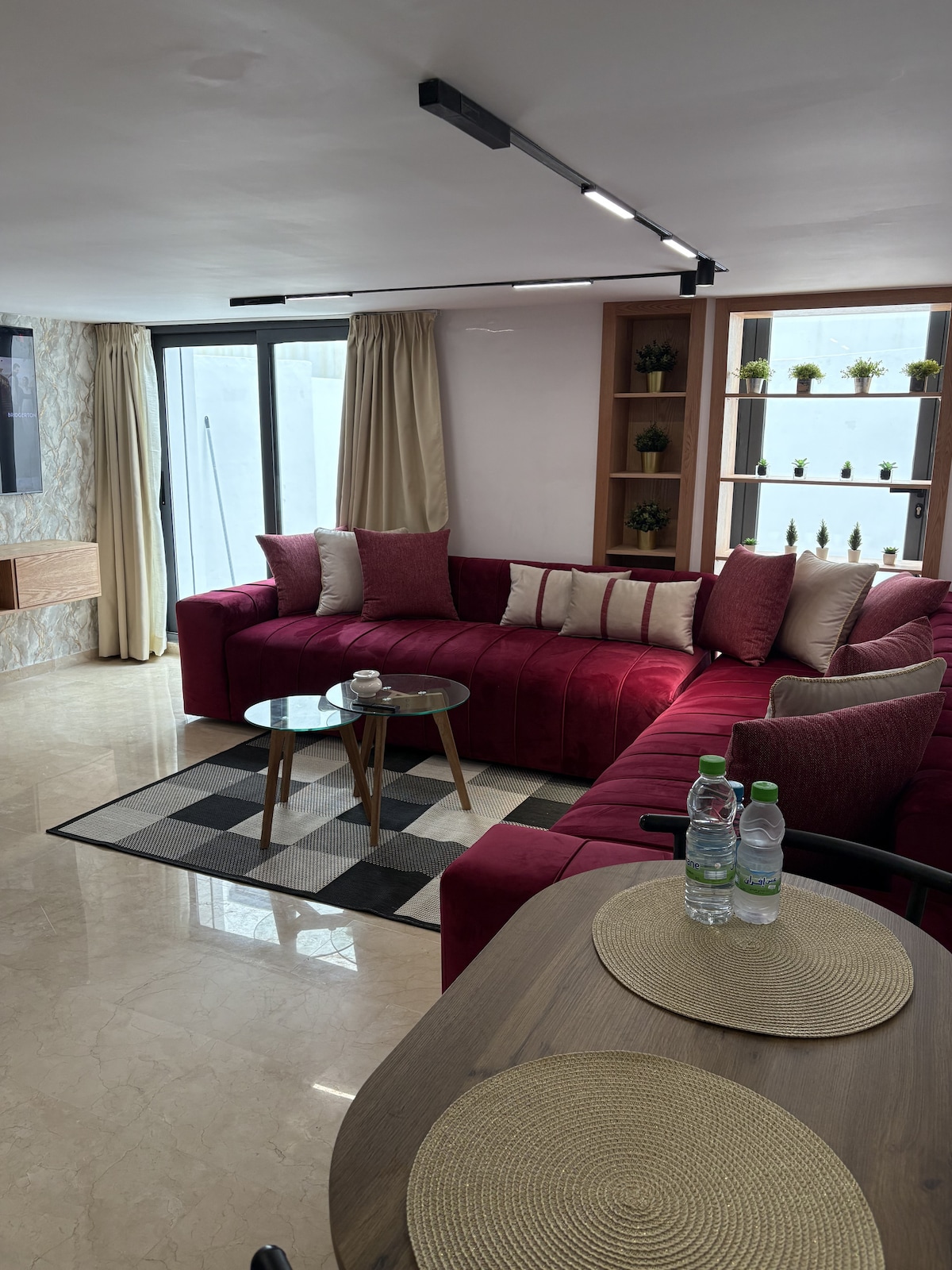 Enjoy a stylish and modern 2-bedroom apartment with a relaxing pool in the calm neighborhood of Wifaq. With three terraces, a spacious living area, and a big TV for Netflix & chill, this home is designed for comfort. The fully equipped kitchen has everything you need to cook like a chef. Just 10 minutes from Hay Riad, Rabat’s most prestigious district with cafés and boutiques, and 5 minutes from Harhoura’s beaches , this well-located stay offers the perfect blend of comfort and accessibility!