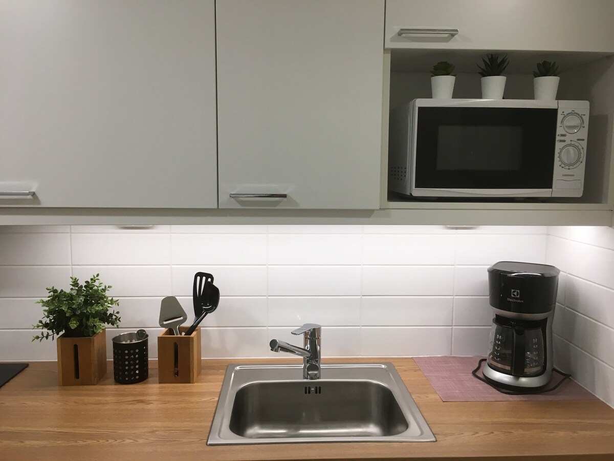 Quiet one-bedroom apartment😊 The apartment features a well-equipped kitchen, living room, separate bedroom, and bathroom. •Bed 120 cm and sofa bed 116 cm •Bed linen and towels included •Heated parking garage park •WiFi free •No washing machine Distance to the city center is 4.5 km by car and 3.7 km on foot. A bus stop, restaurant, and gym are located on the same street. A large K-Supermarket is 600 m away. Nallikari Beach is only 1.5 km away.