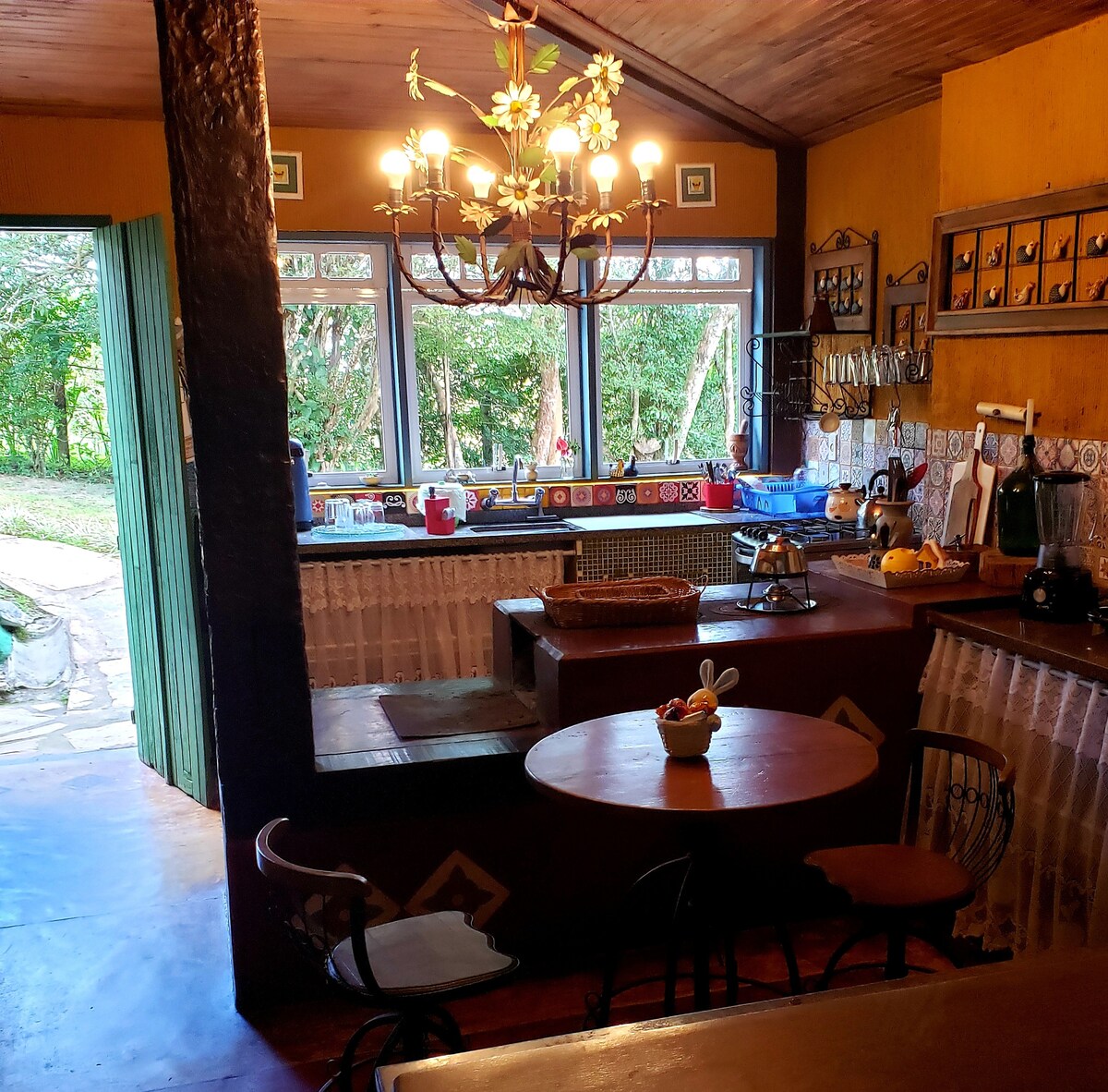 Vila de İtatiaia (MG) şəhərində yerləşən bu füsunkar evin adı var: dağlara və şəlaləyə heyranedici mənzərəsi var. Hər gün təəccüblü bir günəşin doğması və gözəl qürub! Ev asfaltlanmış və çox sakit bir küçədədir. Ətrafı əhatə edən meşələrin və dağların tam təfəkkürü üçün şüşə divarları olan açıq hava mətbəxi və odun sobası. Ulduzlu səma və ay gecələrinin tamaşasını seyr edərək dincəlmək üçün örtülü barbekü sahəsi və qamak.
