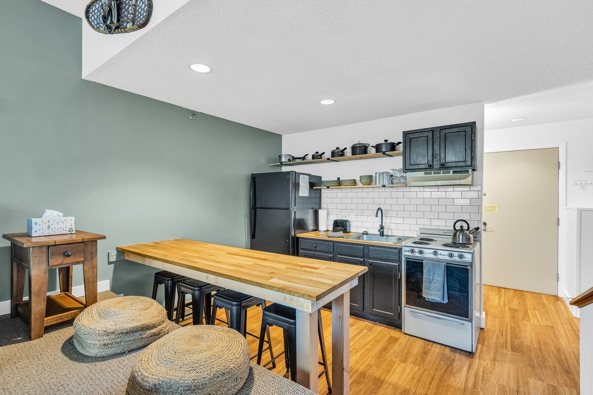 This two-floor ideally located condo is on the mountain between Barker and White Cap Lodges. You can ski in/out using Roadrunner trail, which is right across the parking lot. There is plenty of parking and the condo is located in Building 2, which is closest to the common lodge area with a fireplace and pool/hot tub/sauna access. While this is technically a 1 br, there is a wall between the queen room and the full/twin room for privacy, and a queen size murphy cabinet bed in the living room.