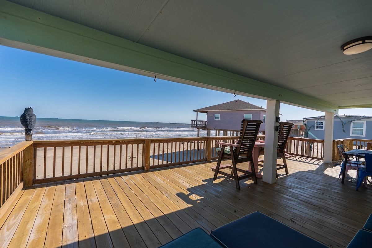 NEW Beachfront Construction! Truly a Unicorn:🦄 LOCATION, LUXURY, and So Nice to Have NEW! Located steps away from the best restaurants and beach in Surfside! Enjoy hammocks and games under the house. Climb the steps to an awesome shaded deck with views from San Luis Pass all the way to the Jetty! More than 180 degree unobstructed views. Bedrooms open to SunDeck and stargazing with fire 🔥 pit YouTube Beachfront Luxe for video $125 cleaning fee and only $75 total for up to 2 pets for whole stay!