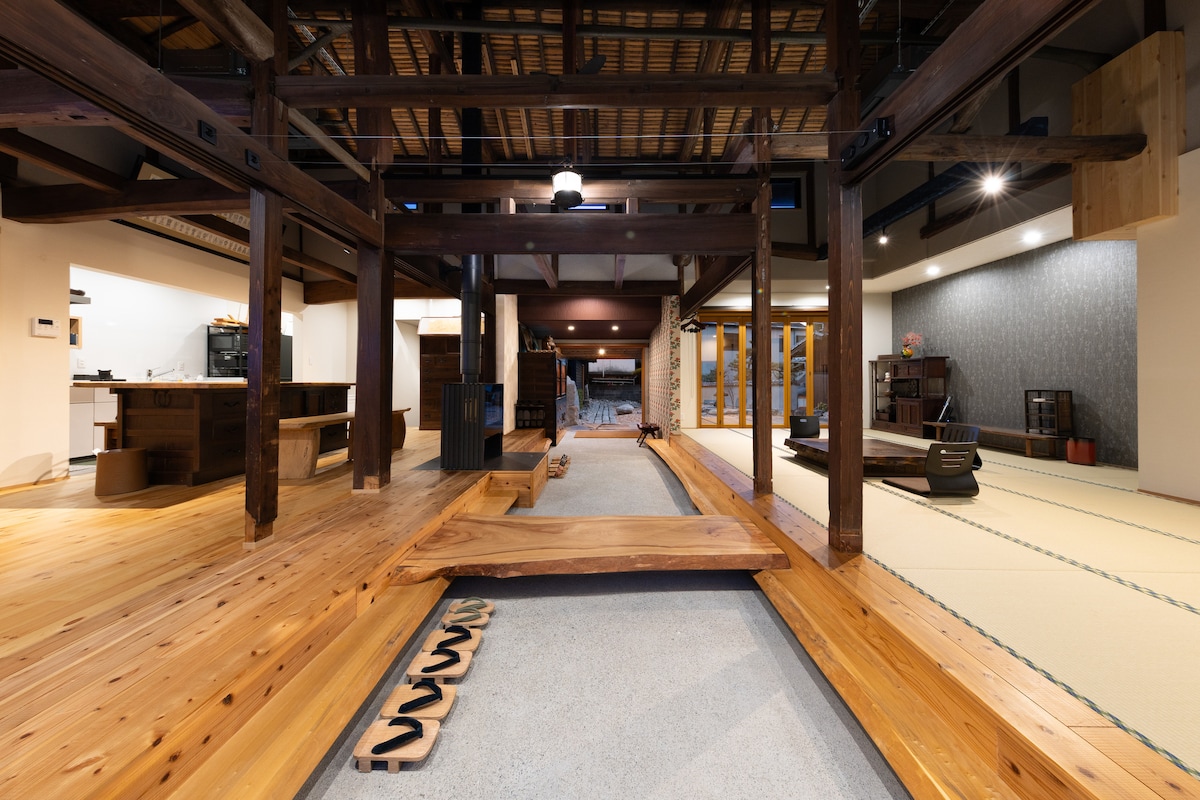 築100年を超える古民家を一棟お貸しします。 通り土間を挟んで、畳敷き一間と無垢材床一間からとなり、広さ55畳の大広間となっています。 屋外では、御影石の石畳と今治産の大島石をお楽しみいただけます。 日本最古の湯 道後温泉まで徒歩5分です。 8名様(お子様も含む)まで宿泊できます。 2名様以上の人数は、追加料金となります。 追加料金は、1名につき10,000円です。 ●周辺案内● 【名所】 道後公園湯築城跡 徒歩2分 道後温泉本館 徒歩5分 道後温泉椿の湯 徒歩7分 飛鳥乃湯泉 徒歩7分 伊佐爾波神社 徒歩5分 湯神社 徒歩5分 曹洞宗 義安寺 徒歩1分 時宗 宝厳寺 徒歩5分 真言宗 石手寺 徒歩10分 【コンビニ】 ローソン 徒歩5分 ファミリーマート 徒歩5分 セブンイレブン 徒歩10分 【スーパー】 スーパーフジ 徒歩10分 業務スーパー 徒歩10分 スーパーABC 徒歩12分 【空港・鉄道】 松山空港 車30分 JR松山駅 車20分
