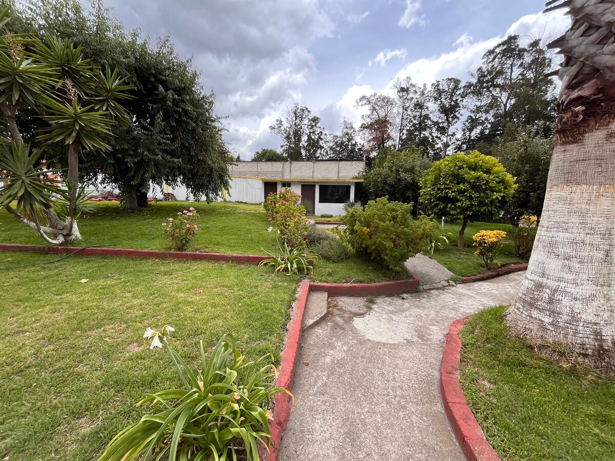 Beautiful country house facing the Popocatépetl and Iztaccíhuatl volcanoes, located in the highlands of Nepantla de Sor Juana, the Village of Poetry. Four rooms are available for rent: two with queen-size beds and private bathrooms, one with two single beds and a private bathroom outside the room, and one with a queen-size bed plus a single bed and a private bathroom outside the room. The hostess lives in the house and will welcome you with great care and warmth.