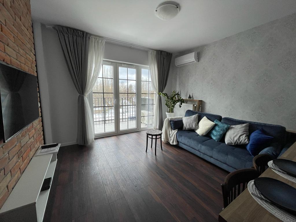 This modernly finished and furnished apartment is located in secured compound in the heart of the city of Lodz. Spacey living room with comfortable sofa, table and 4 chairs, TV cabinet and 55" TV with Play Station for with games as in the photo and with apps like Netflix, Apple Tv, Max, Prime is connected to fully equipped kitchen. Main bedroom queen size bed. Spare bedroom- double bed. One parking spot is dedicated for you, inside the secured area, next to the building.