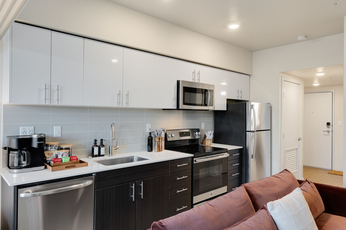 Sietlın mərkəzində yerləşən bu yenilənmiş 1 BR/1 BA kondominiumunda qonaqlamanızdan zövq alın. Kondominiumda 1 150-179 sm-lik yataq otağı, rahat şpal divanı, tam mətbəx, yenilənmiş hamam otağı, daxili W/D, hi-sürətli Wİ-Fİ və qaraj parkinqi var. Monorili balkonunuzdan izləyin! Space Needle-ə 5 dəq, Chihuly və digər muzeylərə piyada 5 dəq. Amazona, sahilə, Olimpiya Struktur Parkına və ya İqlim Girov Arenasına piyada 11 dəq. Pike məkanına piyada 16 dəq. Yaxınlıqda çoxlu restoran, kafe, ərzaq məhsulları və mağazalar var. Öz-özünə giriş.