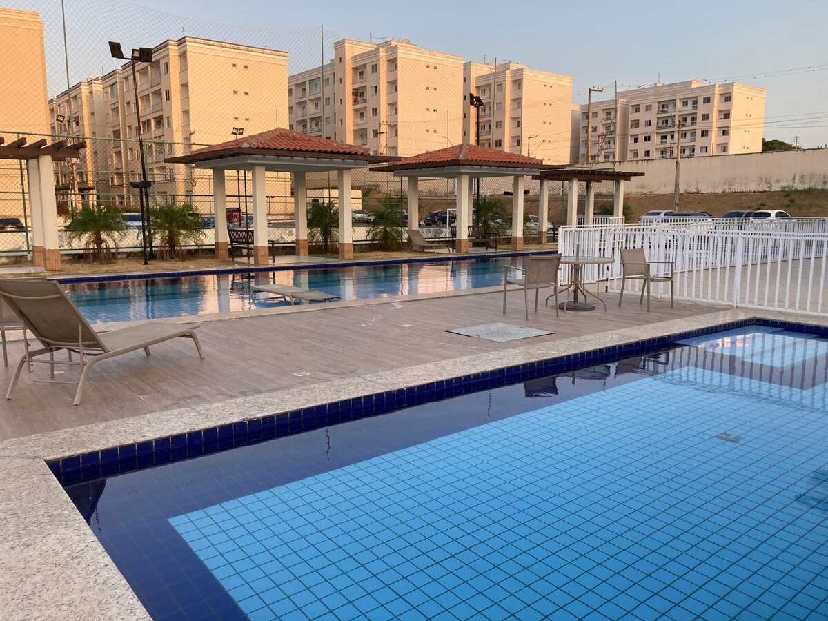 E depois de alguns anos, voltamos!! O apartamento fica no Bairro Aracagy (região de praias), a 2,5 km da praia do Araçagy (4 min de carro) uma das mais limpas da ilha. Condomínio tranquilo e reservado, bom para casais e ideal para você e sua família DESCANSAR. Tem 2 PISCINAS, AR-CONDICIONADOS nos quartos, Internet WI-FI, 2 camas de casal, TV, geladeira, fogão, máquina de lavar roupas, utensílios de cozinha (pratos, panelas, talheres e etc...), roupas de cama, toalhas, 2 chuveiros elétricos.