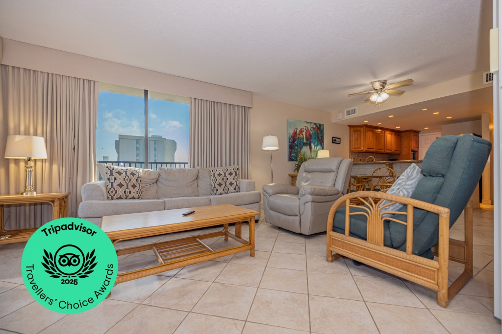 The Isla Grand Beach Resort condo features views of our pools, along with beach views. Condo #305 rooms accommodate up to 6-ppl with 1-king bed, and 2 twin beds in the second unit, and a sofa sleeper in the living room Our Condo unit Features: 2 Balconies 3 Televisions with 74- Spectrum channels Sleeper Sofas in selective rooms (included) Iron and Ironing Board Hairdryer Full size refrigerator Full size kitchen Free Wireless Internet Digital In-Room Safe at this cheerful getaway.