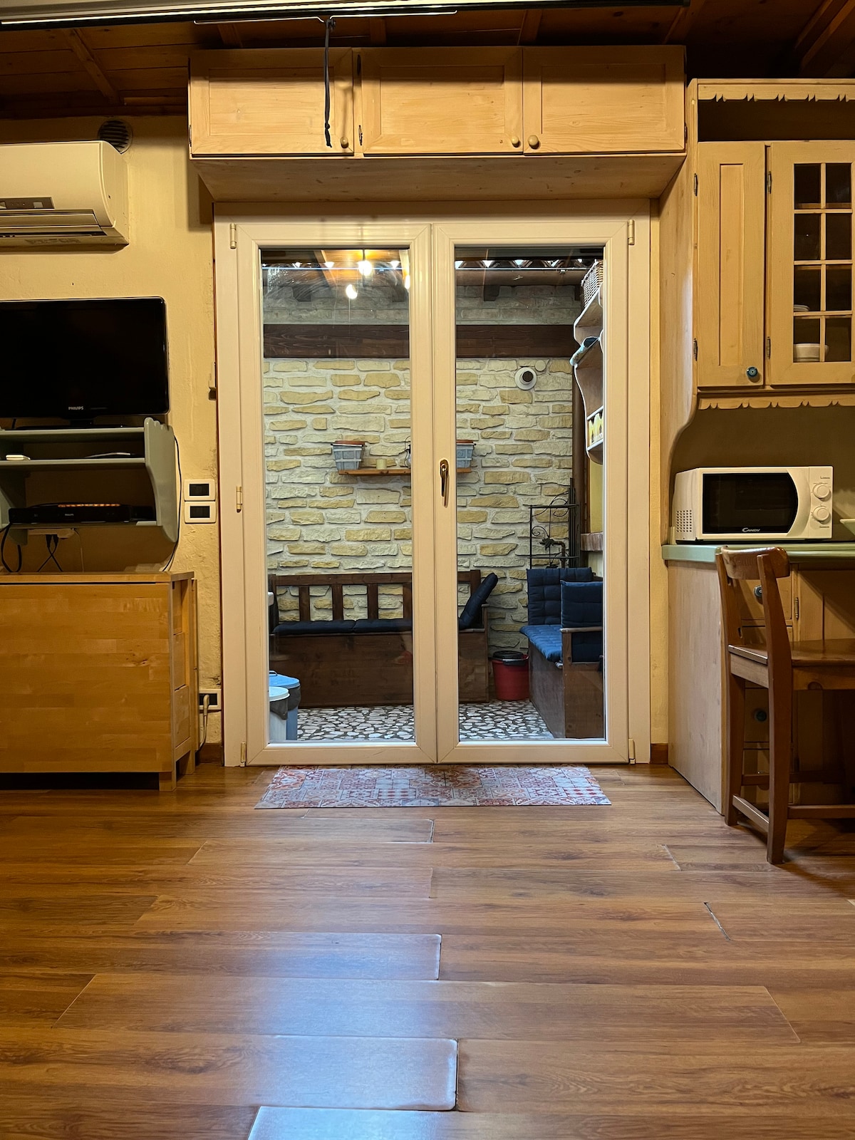 Mənzildə taxta ilə örtülmüş rahat otaqlar var. Yayda təravətli, qışda isə isti. İki nəfərlik otaqda paltaryuyan maşın olan kiçik bir hamam-tualetə birbaşa giriş var. İkinci yataq otağında çoxmərtəbəli çarpayı var. Açıq havada kiçik bağça sizə açıq havada nahar etməyə imkan verir və buxarı barbekü bişirmək üçün təchiz olunub. Açıq məkanda qabyuyan maşını olan kiçik, yaxşı təchiz olunmuş balaca balaca mətbəx var. Künc divanı kvadrat yarımlıq rahat çarpayıya çevrilə bilər.