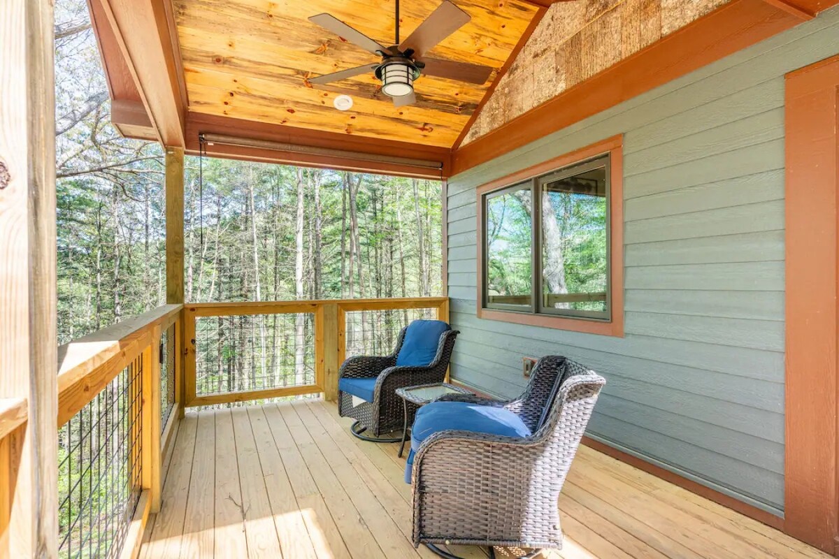 "Milli meşə ilə əhatə olunmuş və təcrid edilmiş Appalachian Cığırından qısa piyada məsafədə yerləşən Rustik kabinə. Kabinədə istilik və istirahət üçün qaz buxarı və çöldə istirahət etmək üçün odun çuxuru var. Loftda tam ölçülü çarpayı və əsas mərtəbədə bir əkiz ilə kifayət qədər yer var. Kabinə istirahət yeri kimi qurulub, mobil xidmət yoxdur, lakin peyk Wi-Fi mövcuddur və ağıllı televizor, yüksək texnologiya deyil, lakin xarici dünya ilə əlaqə saxlaya bilərsiniz.