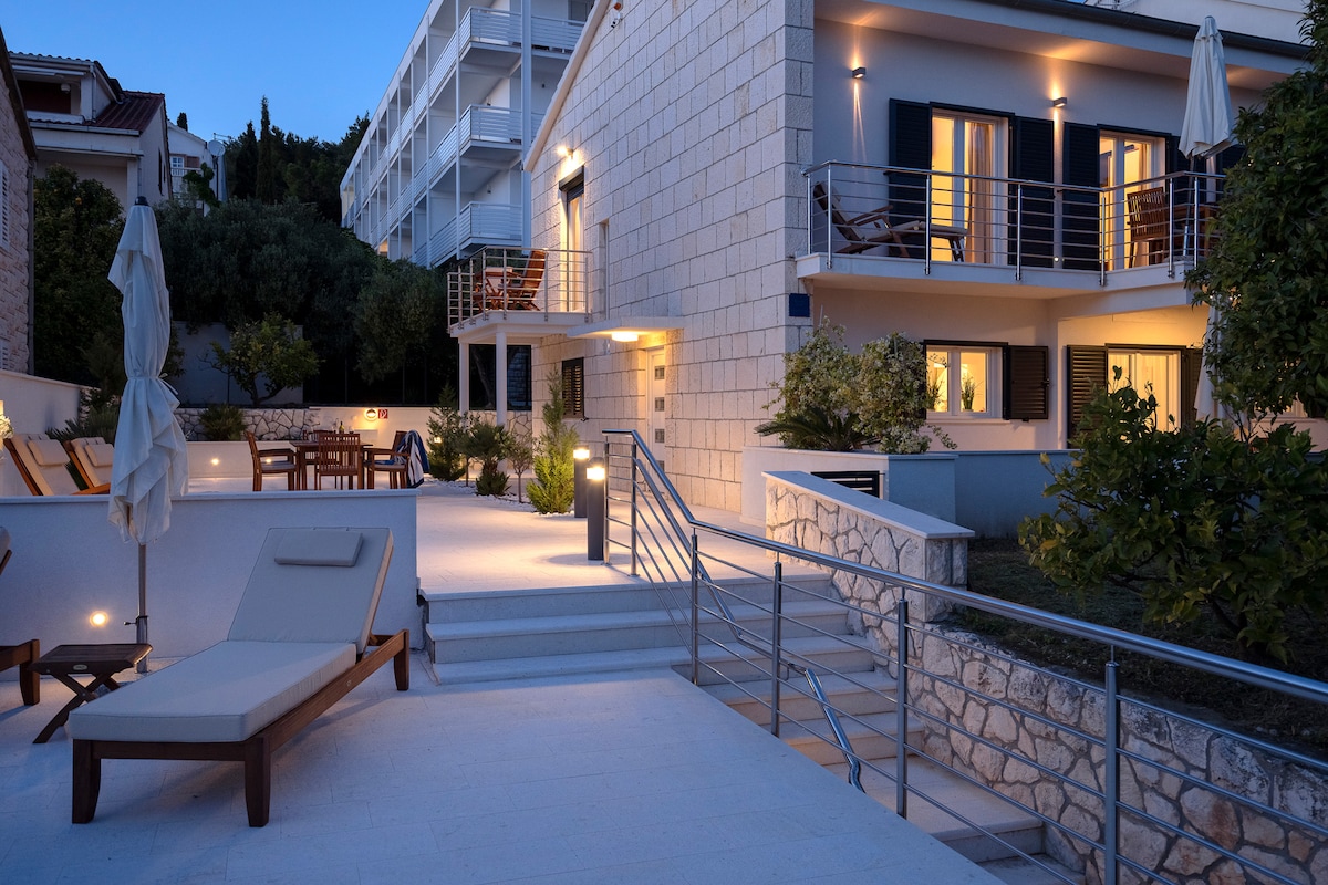 Tamamilə təmir edilmiş və ən yüksək keyfiyyətli materiallarla bəzədilmiş 2 ayrı mənzildən ibarət köhnə daş ev. Açıq hava məkanı Brak adasının ağ daşları ilə dizayn edilib (məsələn, "Ağ Ev" in sütunları "). Qonaqlarımız üçün çay mebeli və barbekü də mövcuddur.